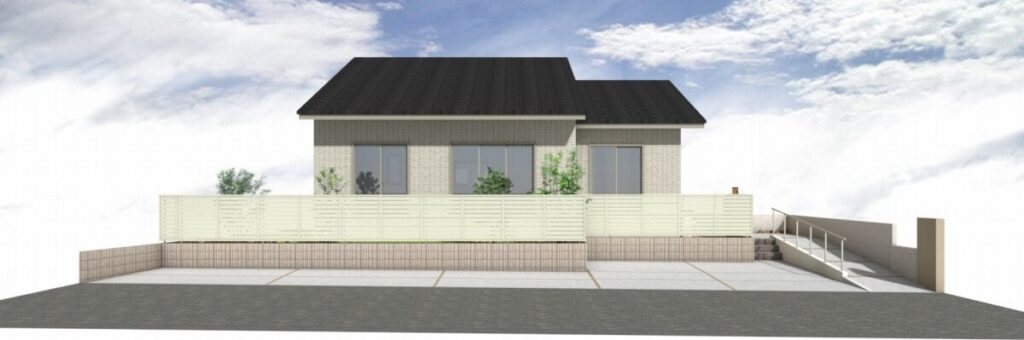 土留め化粧ブロック「ユニソン アルタ」の上にフェンス「LIXIL フェンスAB YS3型 チェリーウッド+シャイングレー」を設置し目隠ししました。(イメージパース図はシャイングレーになっています)
