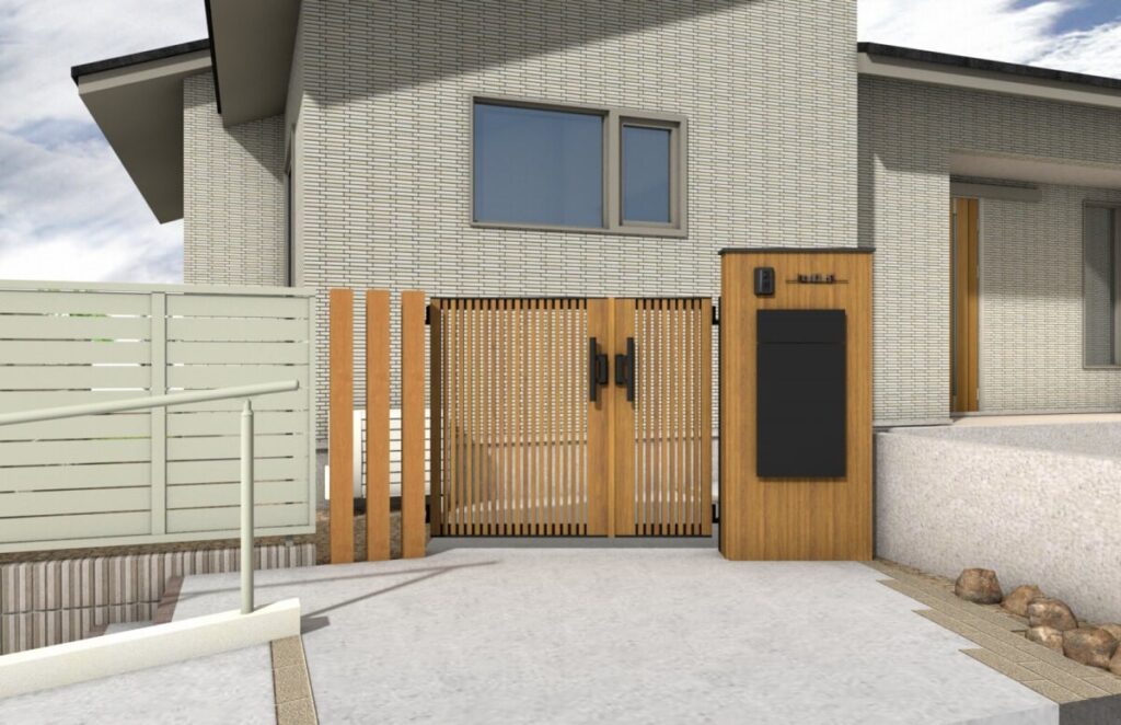 バリアフリー化と統一感ある木調で囲まれた新築外構です。