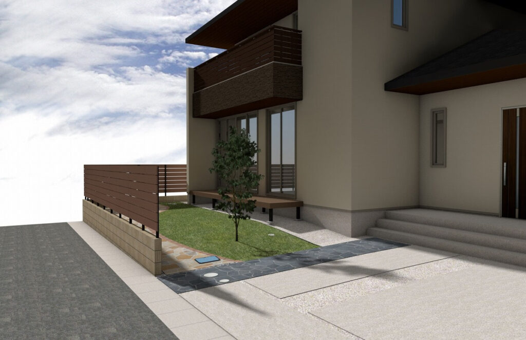 アプローチは重厚感のある色合いで、お庭はナチュラルで明るい色合いがマッチしています。