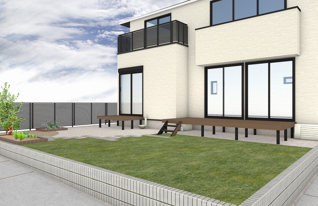 お庭は人工芝と砕石の間に天然石の平板で園路を設け奥行き感を演出。