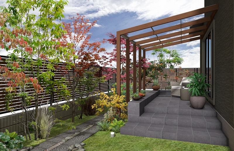 黒い外壁でシンプルにまとまったおうちに雑木や芝の『緑』・フェンスやテラスの『茶色』で彩りを加えました。