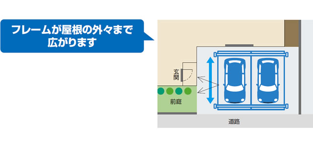 また、フレームのレイアウトを前後方向に角度をつけるなど生活スタイルや敷地に合わせた柔軟なプランニングが可能です。