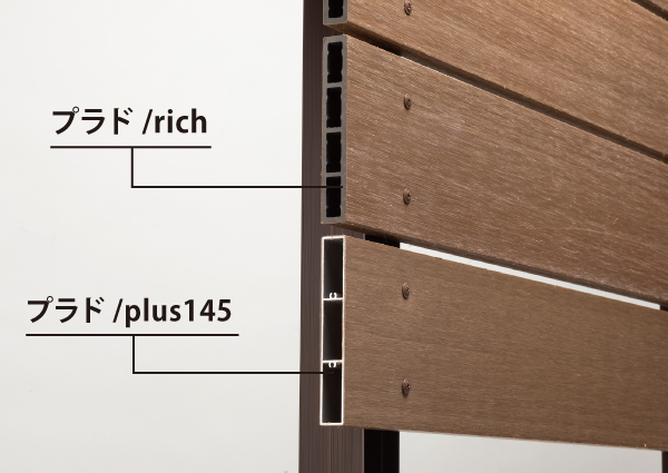『PLAD rich+(プラド リッチプラス)』は、表面仕上げが同じ「PLAD rich(プラド リッチ)」と「PLAD plus145(プラド プラス145)」を組み合わせたフェンスです。