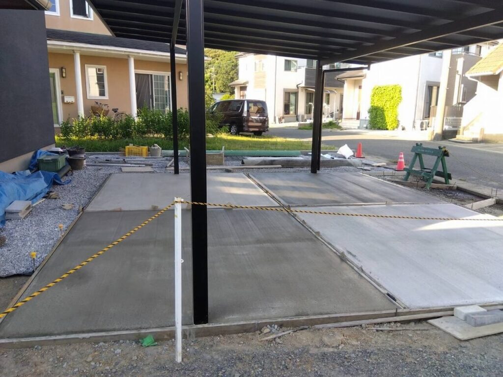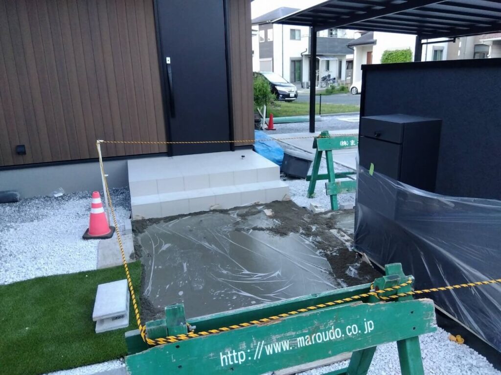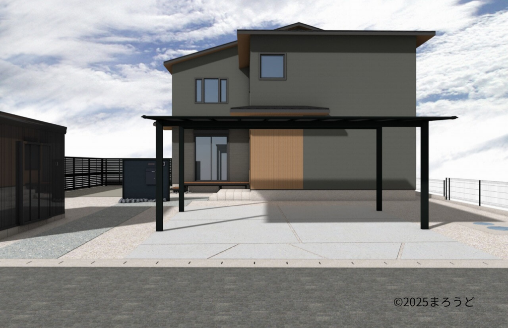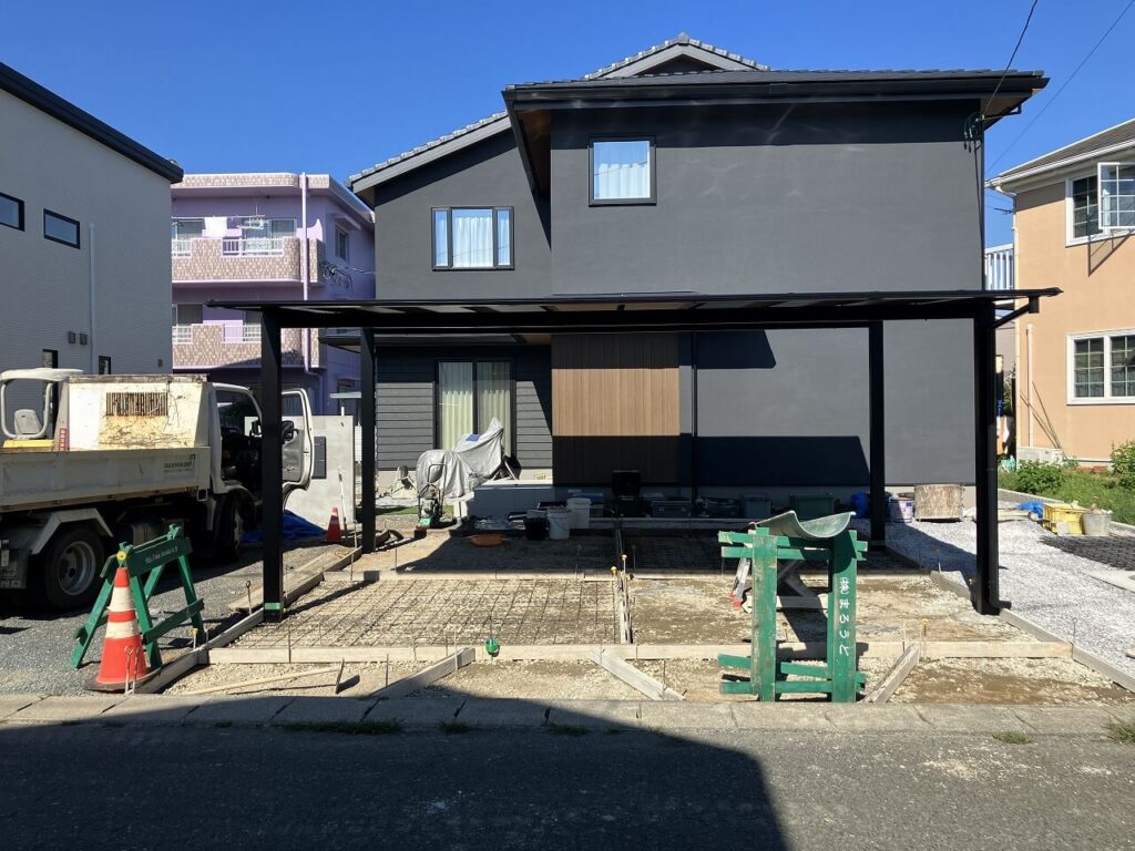 お施主様は《車内温度が暑くならないようなカーポートとバイクガレージが欲しい。建物(ダークグレー系外壁)に合わせて、カッコ良さオンリーの外構にしたい。》ということでした。