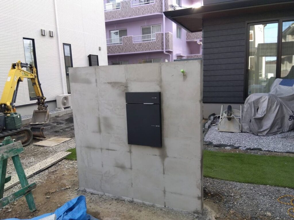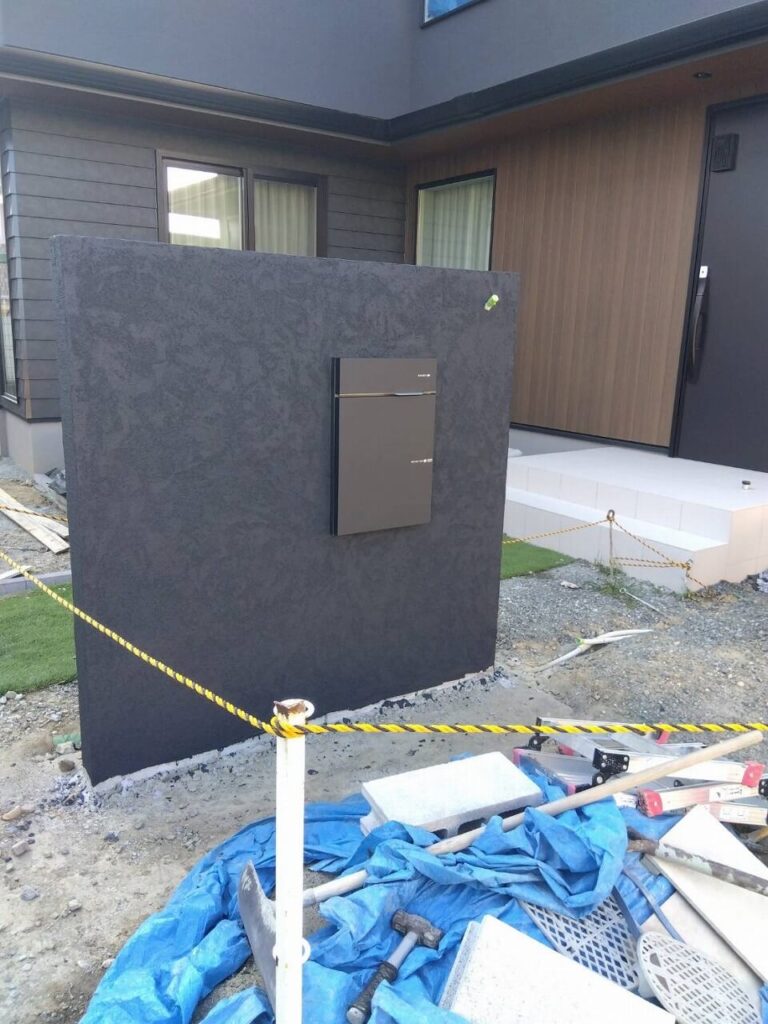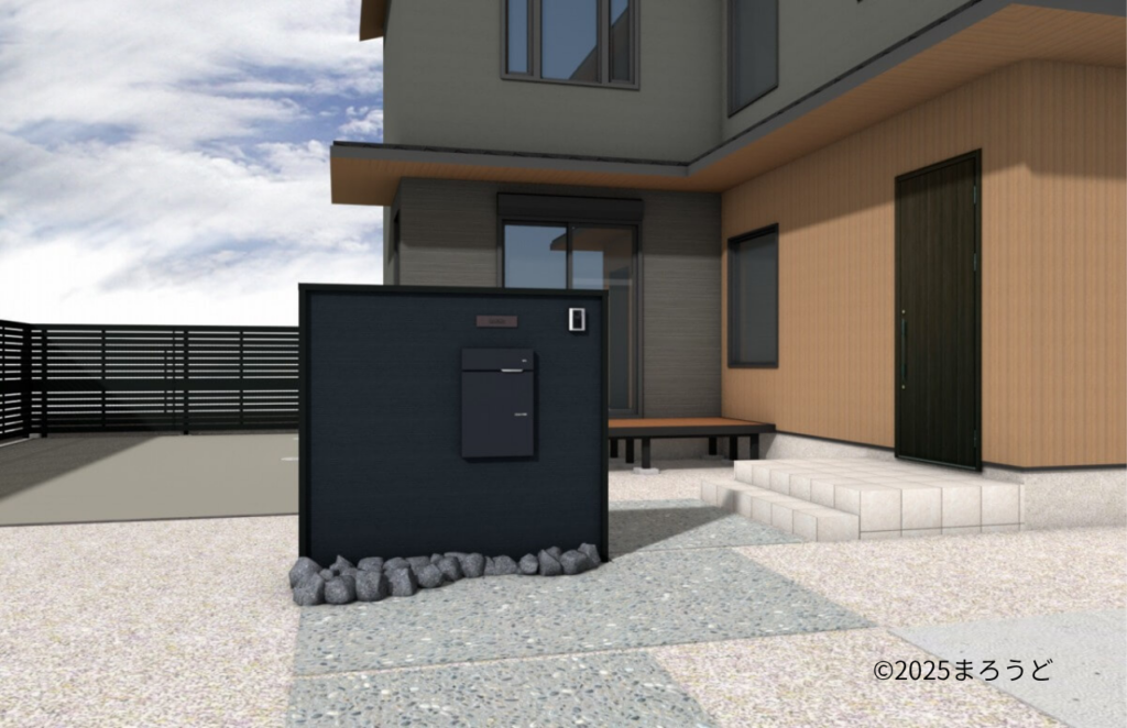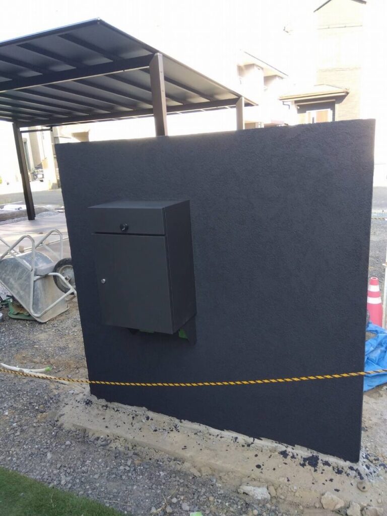門壁はブラックの塗壁に宅配ボックス「ユニソン ヴィコDB100 ポストあり」は埋め込み仕様で設置し、インターホン・表札「オンリーワン モノム ブラック」を取り付けします。笠木「三協アルミ フィオーレブロック笠木」を縦枠にも用いコの字型にぐるりと囲ってカッコいいイメージにしました。仕上げは割栗石(黒)を転がします。