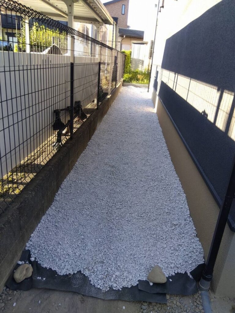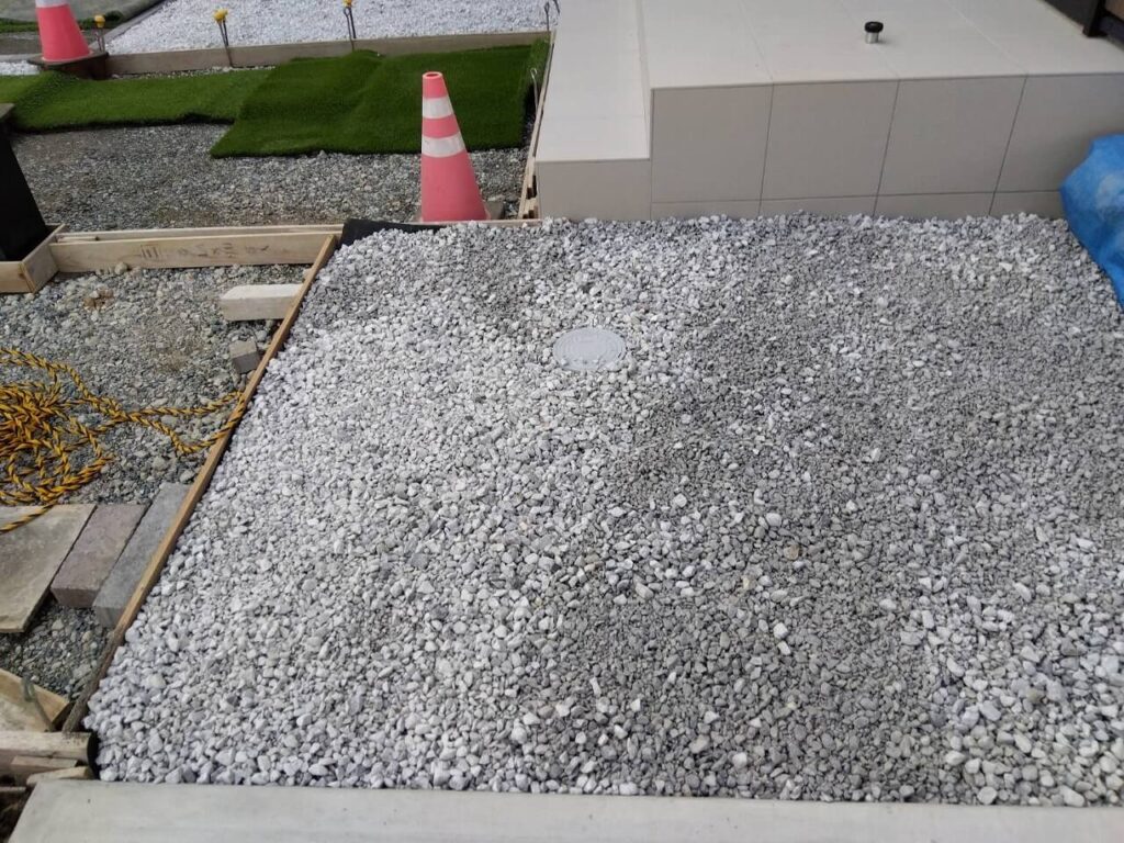 建物まわりは防草シートとビリ砕石を敷き均しました。