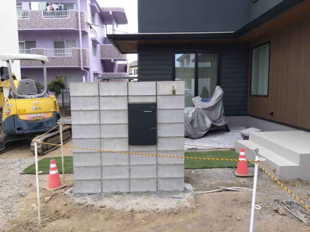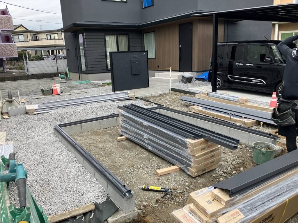 南側と西側をL字で目隠しフェンス「三協アルミ 多段フェンス 上段レジリアYK3型 H1000 下段レジリアYK3型 H800」を独立施工するため、基礎ポストを設置しています。