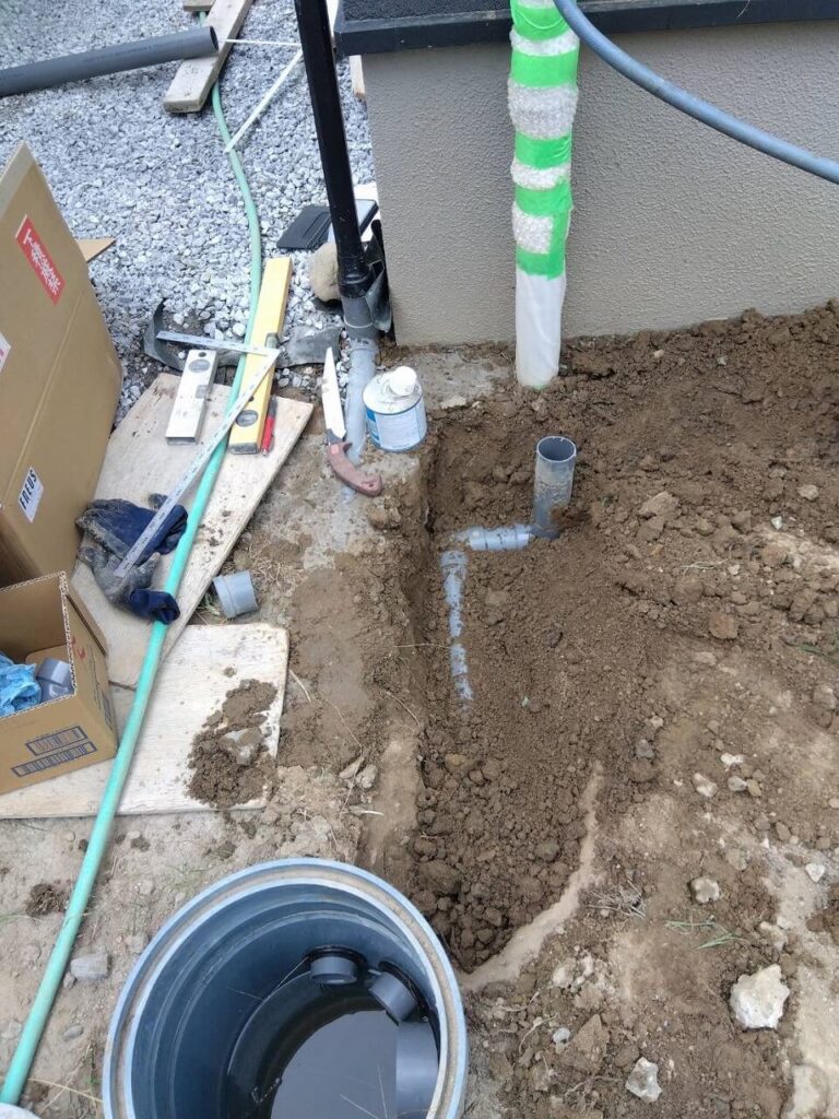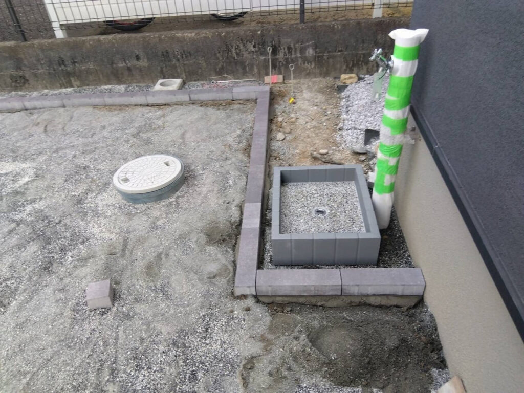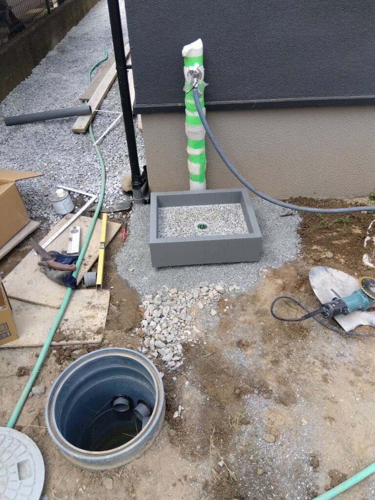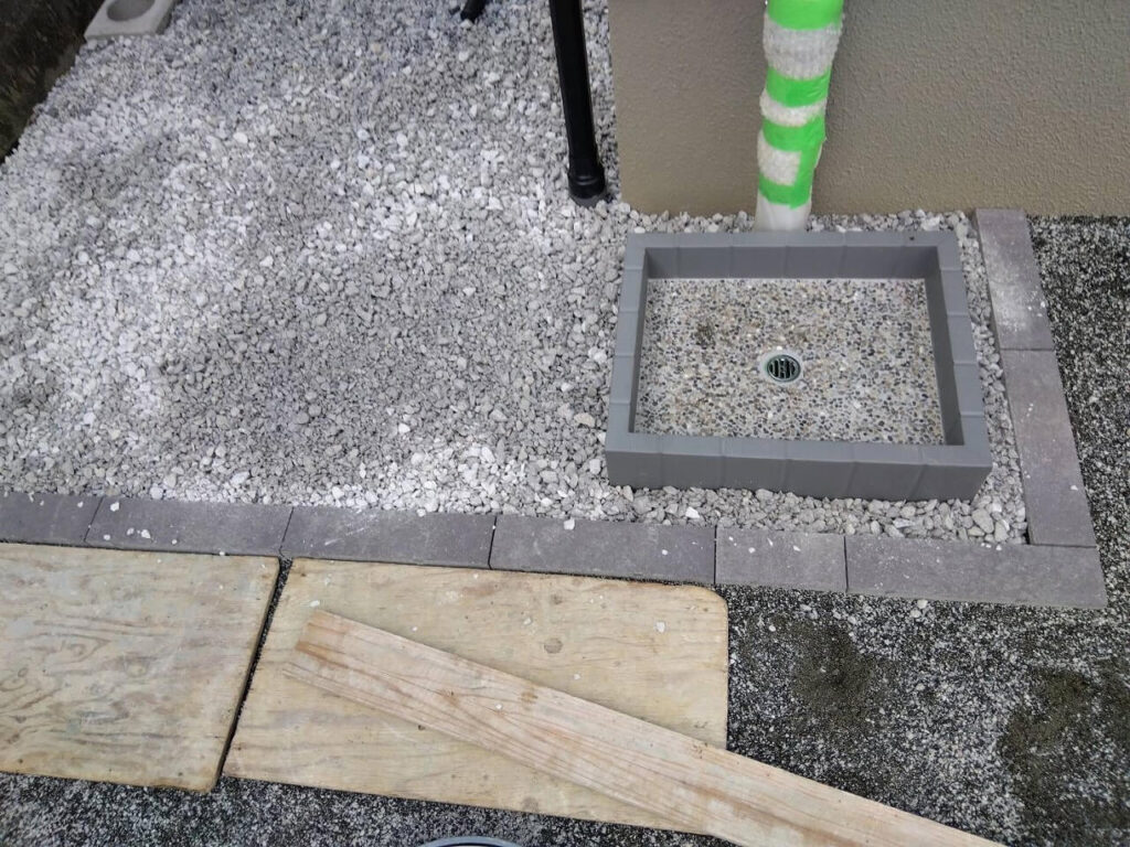 ガーデンパン「ユニソン フレウスパン アーバンキャスト」を設置し、既存の雨水桝へ接続しました。