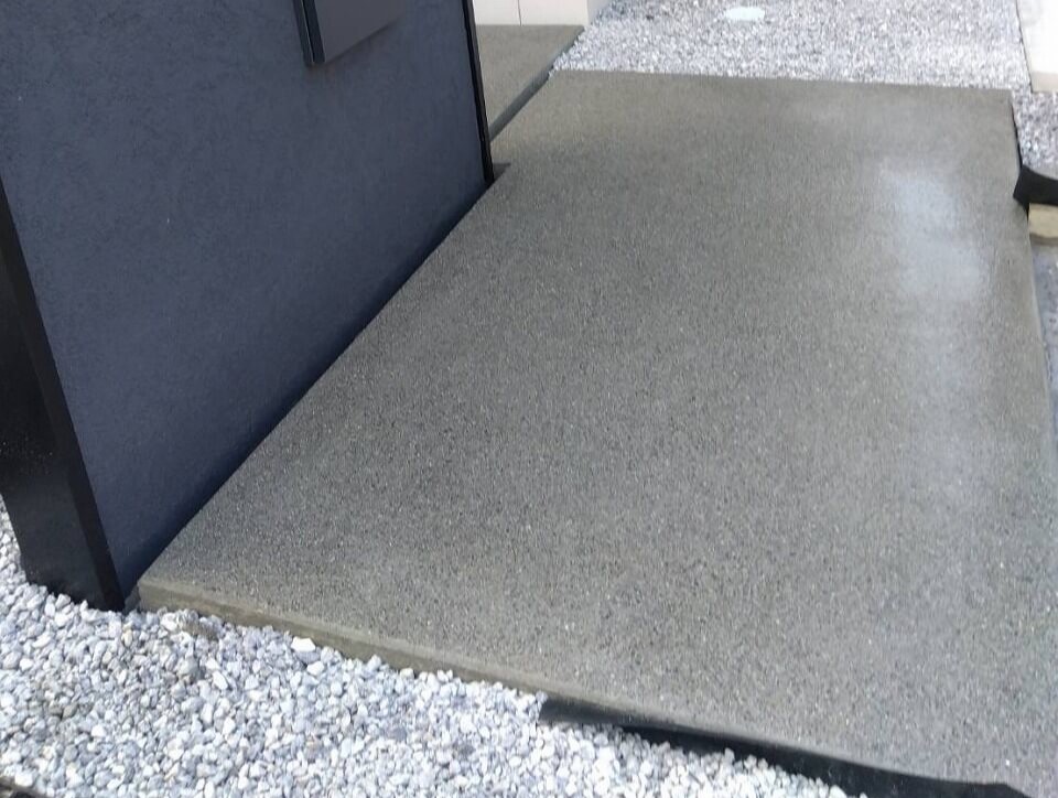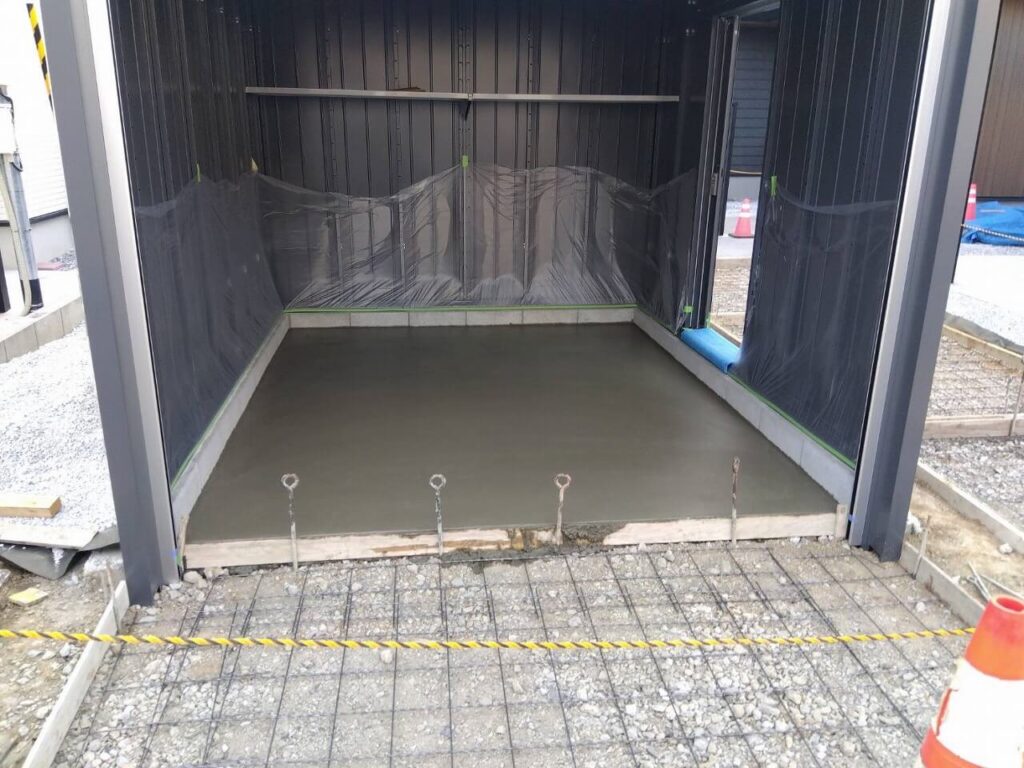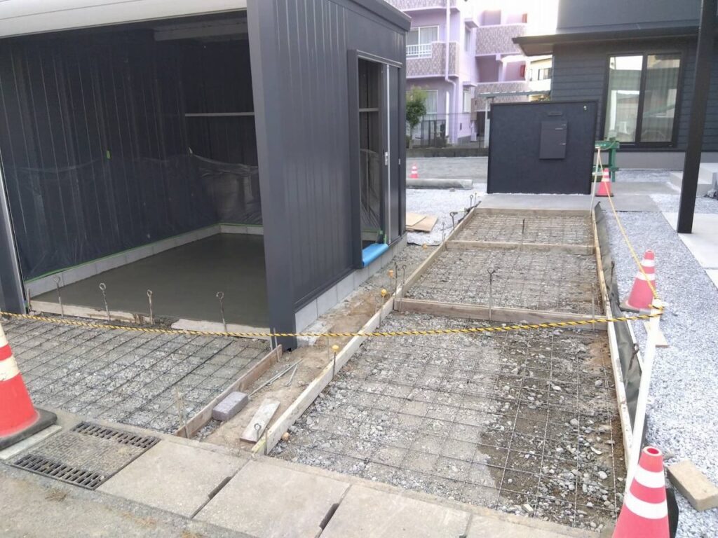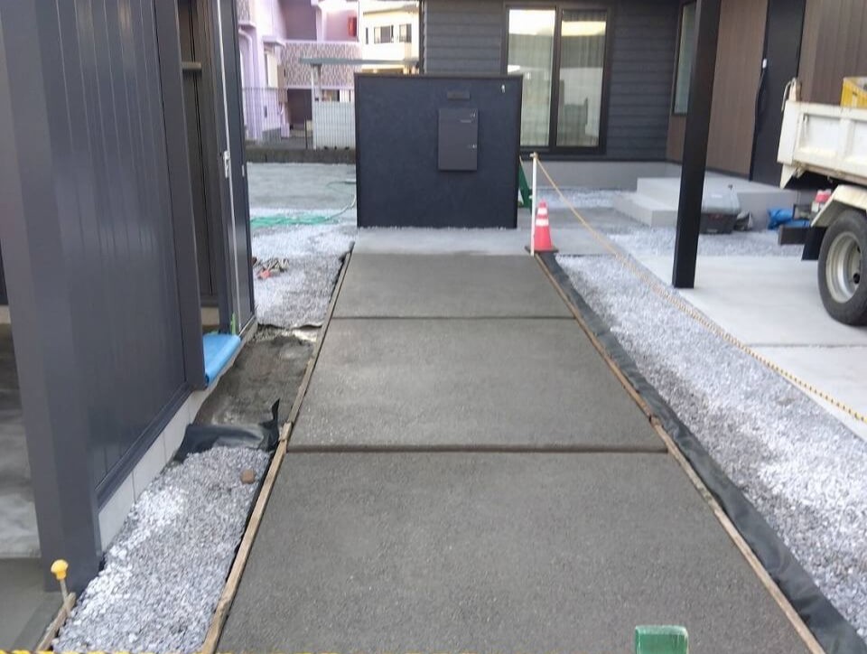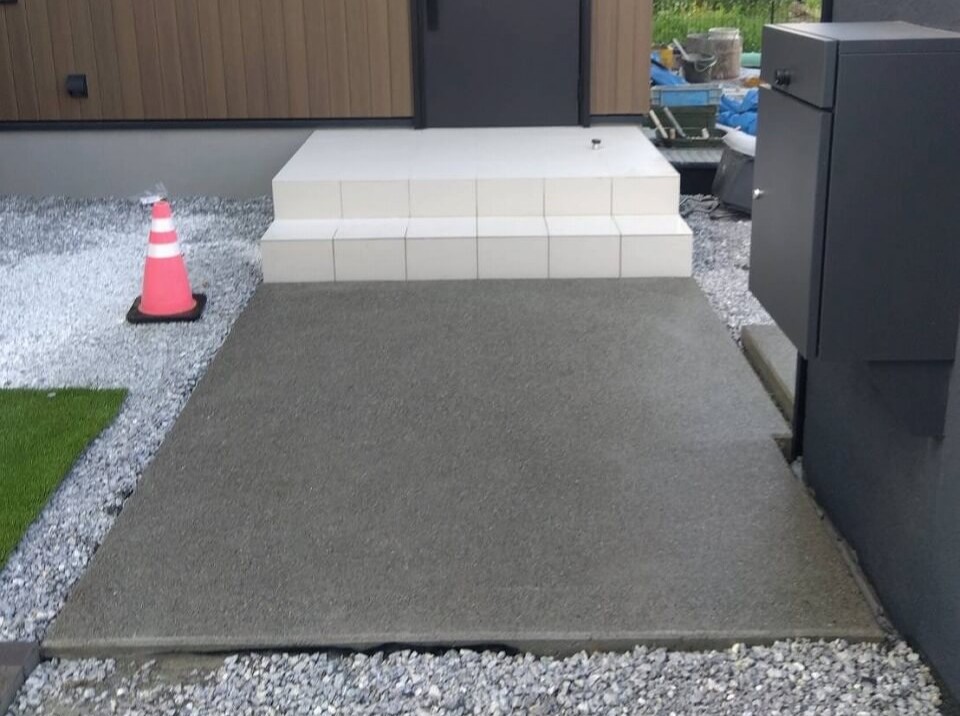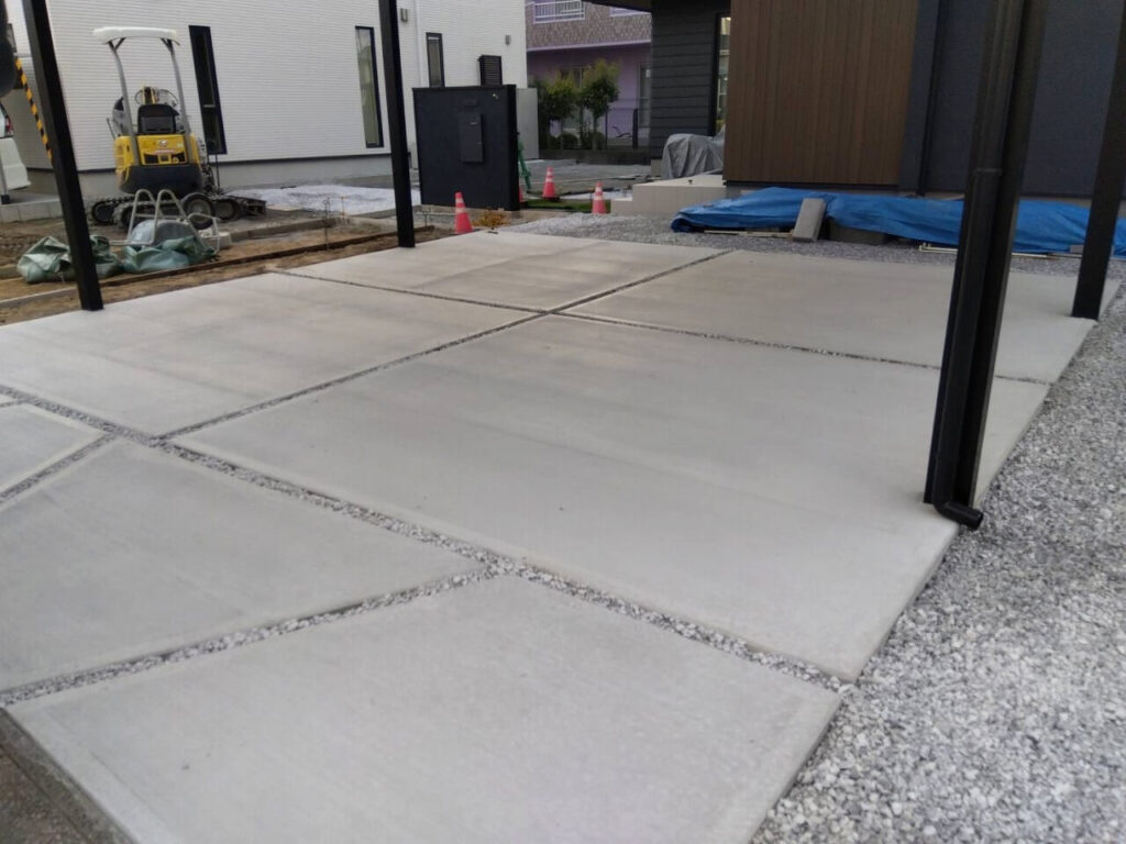 バイクガレージ内床はコンクリート金ゴテ仕上げ、シャッター下前と駐車場はコンクリート刷毛引き仕上げ、アプローチはコンクリート洗い出し仕上げとしました。