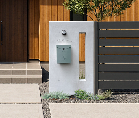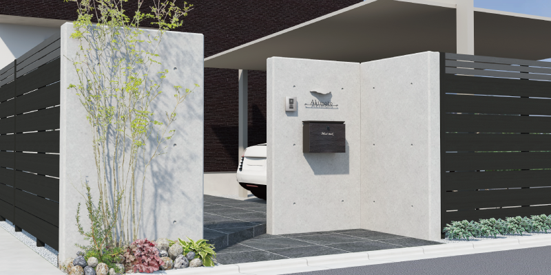 ポストや表札、照明も取り付け可能で門壁としても使えるRC調のデザインウォールは《スタイリッシュでカッコイイ》住宅外構にぴったりです。