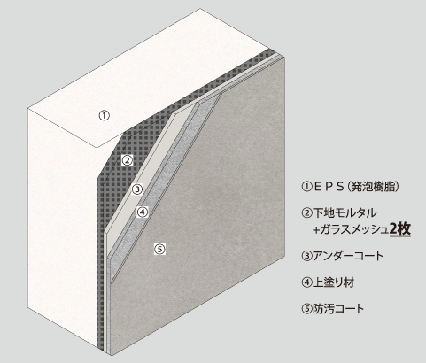 基材の発泡と表面の防汚コートの間には、モルタルやガラスメッシュなどを重ね、強度を保っています。