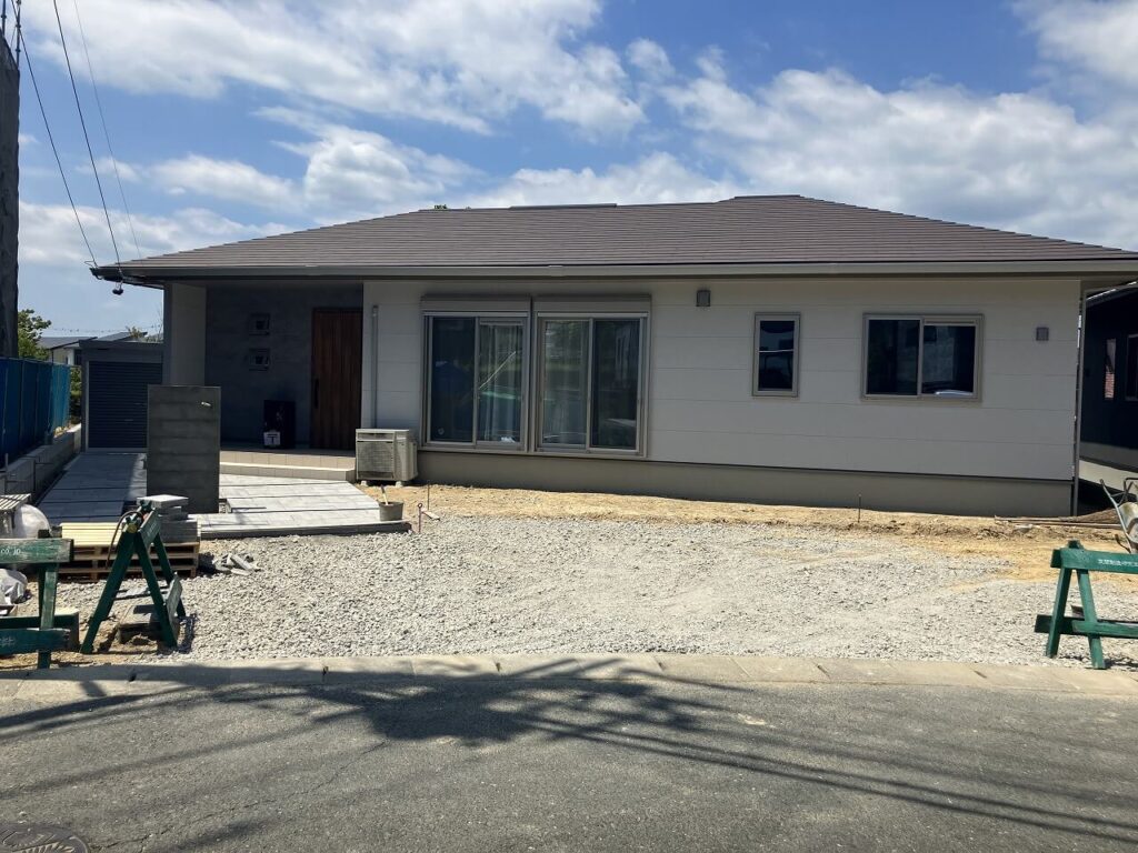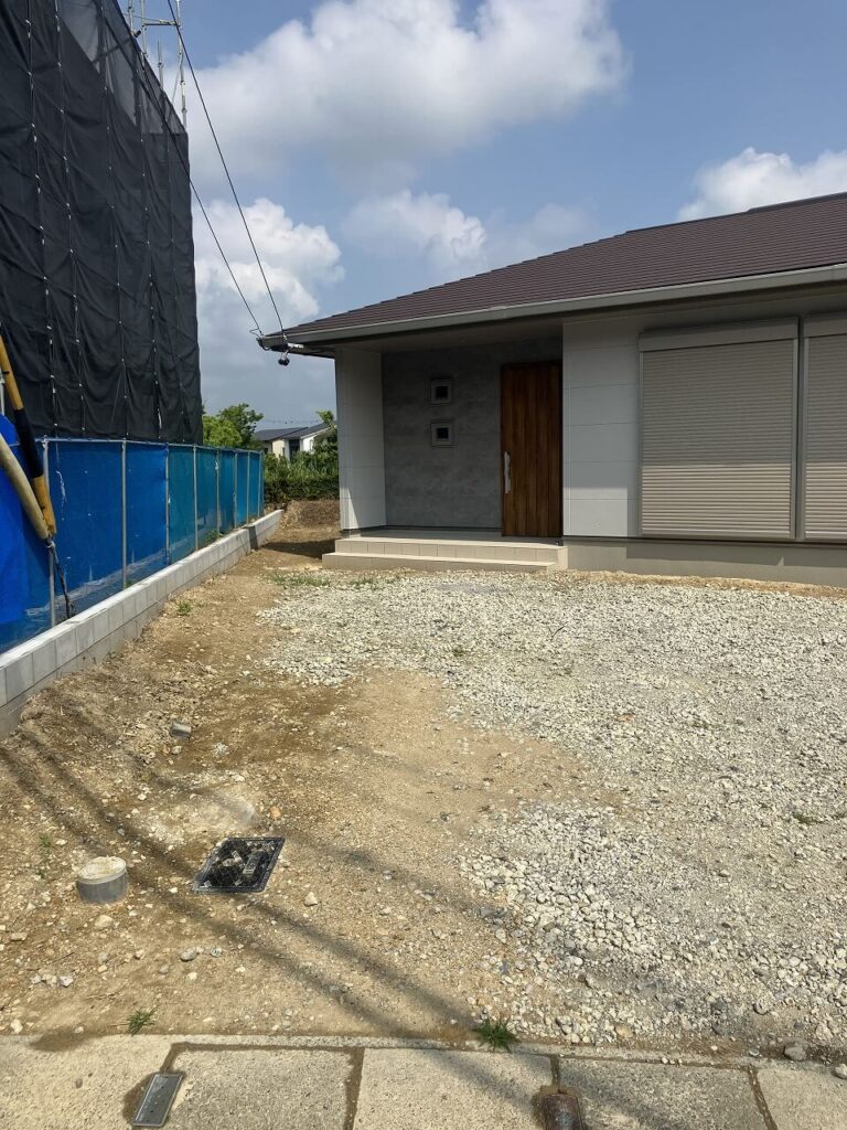 建物まわりは防草シートとビリ砕石を敷き均しました。