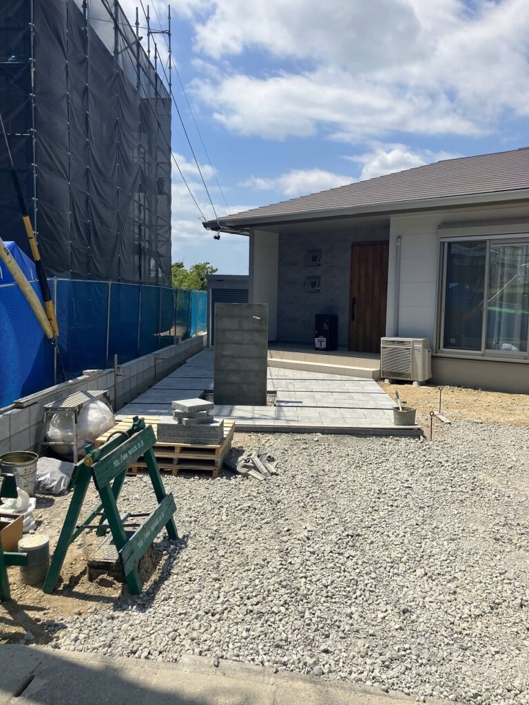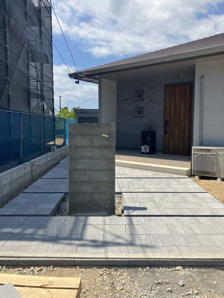 玄関ポーチ前部分は十分な勾配が取れなかった為、透水性の平板で仕上げる事で出来る限り水がたまらないようにしました。