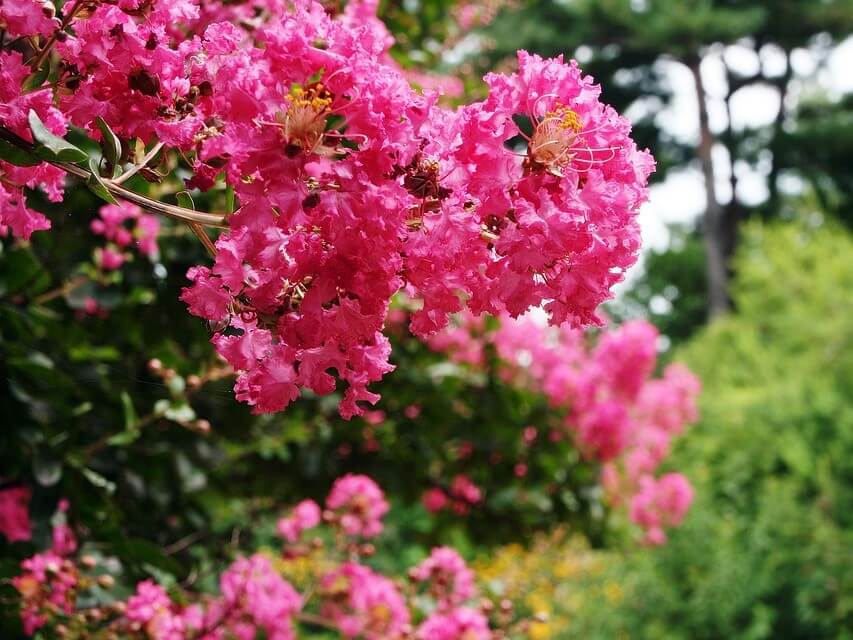 サルスベリ(百日紅)は夏にフリルのような花びらを付けた小さな花が、穂のようにまとまって咲きます。開花期が長く、花色は白、ピンク、赤などから選ぶことができます。