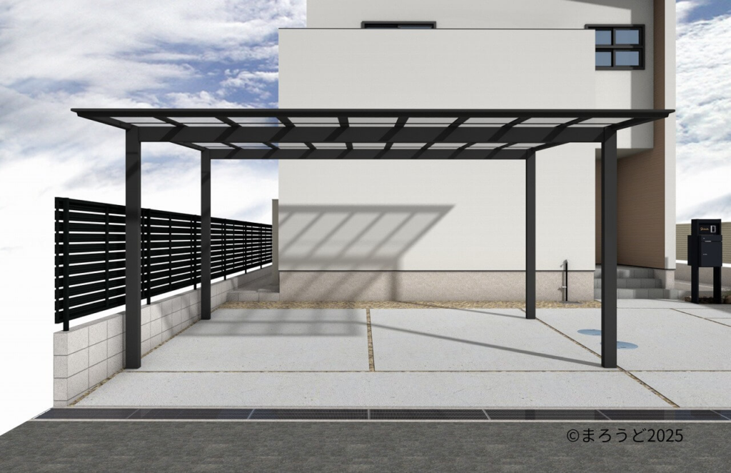 カーポート「LIXIL ネスカF 2台分」を設置し、駐車場とアプローチはコンクリート打ちしました。