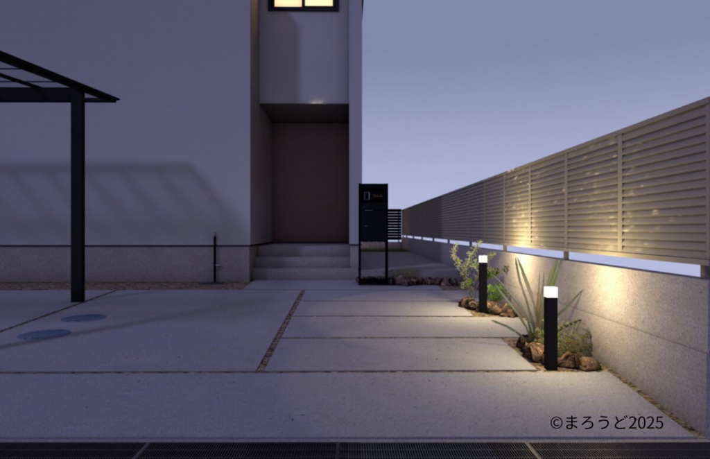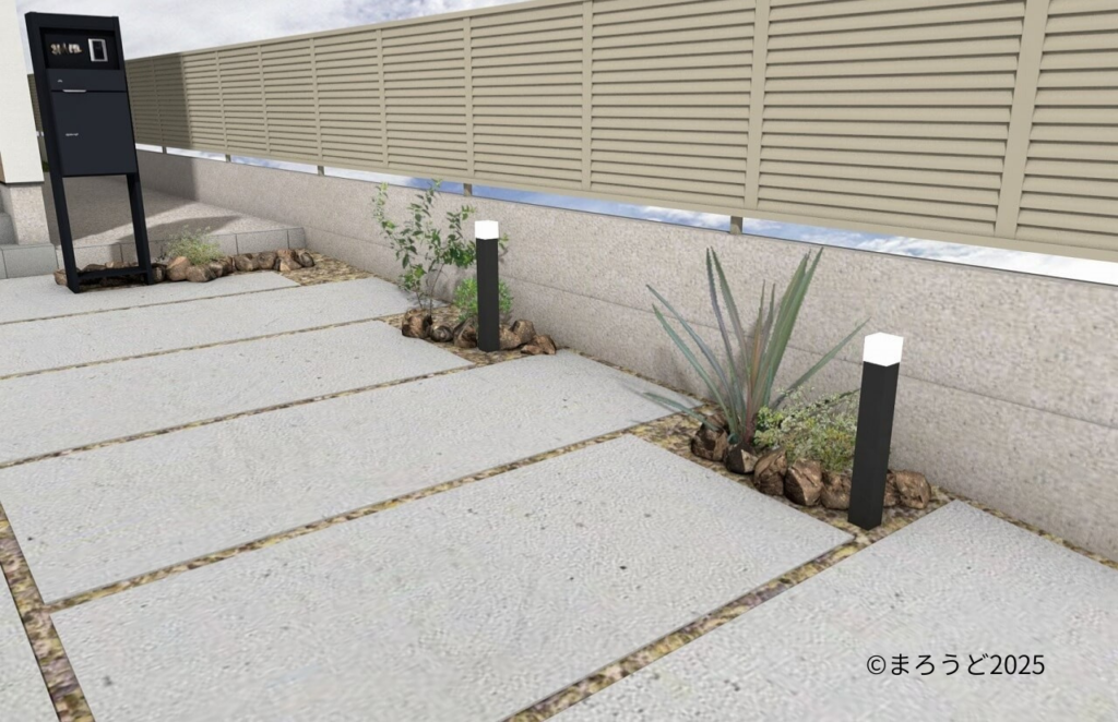 お施主様は《道路側溝部分を綺麗にしたい。街灯もないので照明を付けたい。庭部分へはリビングから出られるように階段が欲しい。庭で過ごす時、視線が気にならないようにしたい。》ということでした。