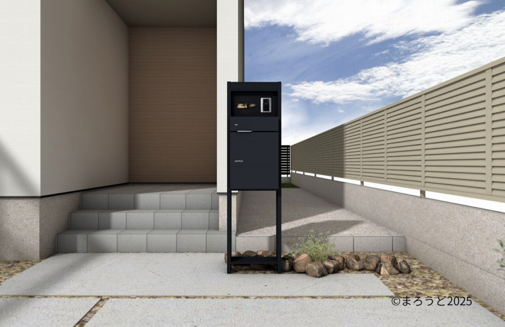 機能門柱「ユニソン ヴィコDB門柱スタンド」に宅配ボックス「ユニソン ヴィコDB100 ポストあり マットブラック」、表札「オンリーワン スクリプト Sサイズ ゴールド」、インターホンを取り付けました。
