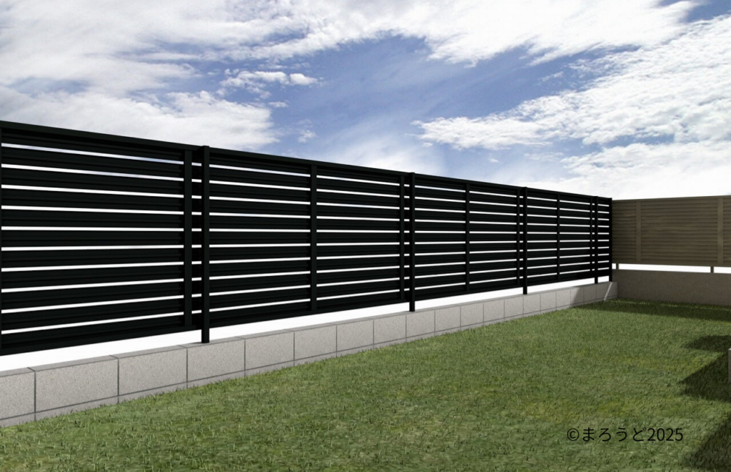 南側・東側境界はコンクリートブロックを積み、目隠しフェンス「三協アルミ レジリアYK3型 H1200 ブラック」を設置しました。