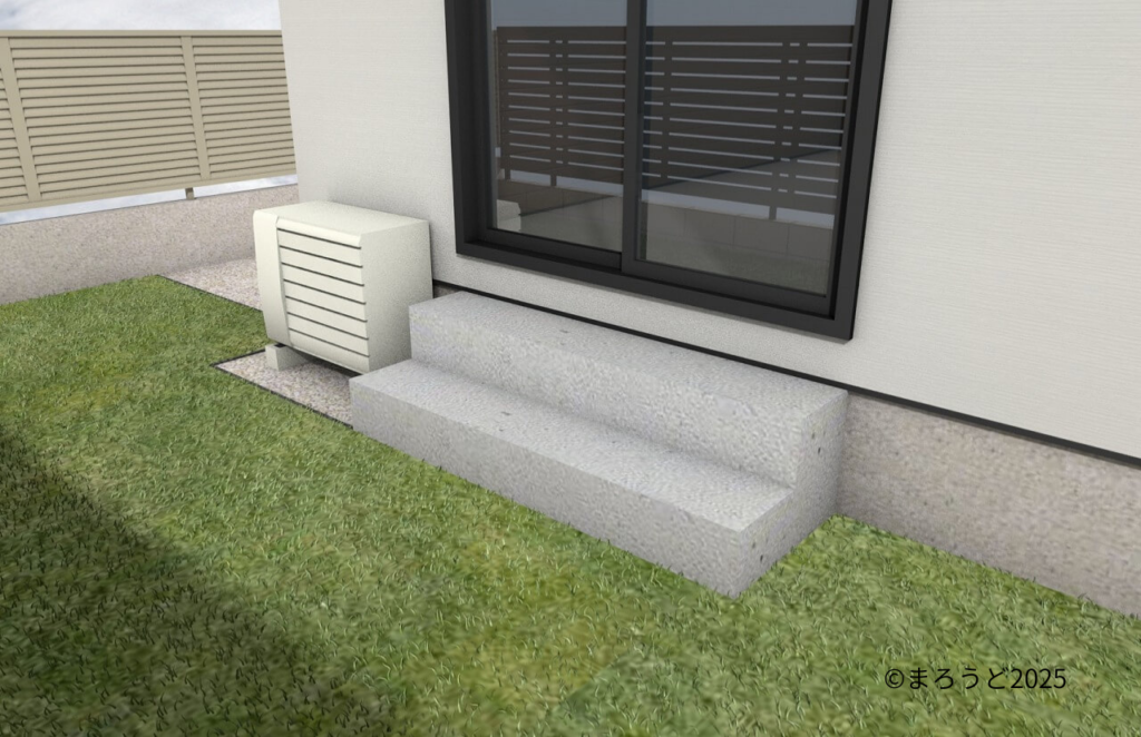 お家から庭への階段はコンクリート仕上げ、人工芝「エクアライブ ZEROturf」も施工しました。