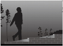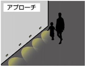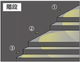 人が段差に置いて目印として認識する3ヶ所を照らすことで、充分な明るさが得られ、安全な段差の通行を可能にします。