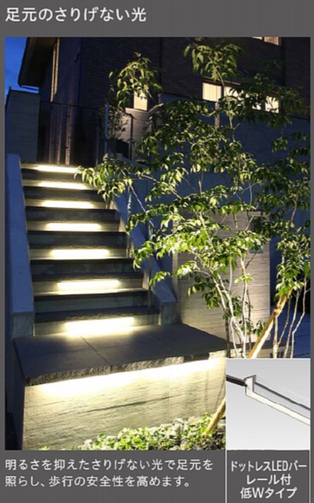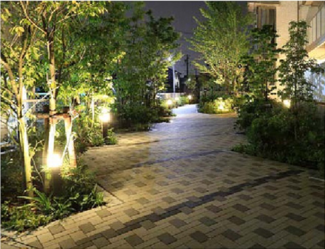 アプローチ面だけでなく、周囲を低い位置の光源より照らすため、安心感、落ち着きを作り出し優しい光で安全を作ります。