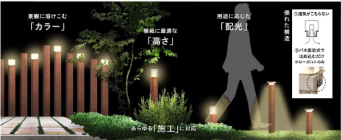 タカショーの『エバーアートポールライト』は、建築やエクステリアに合わせ景観に溶け込み、統一感のある空間が演出できます。