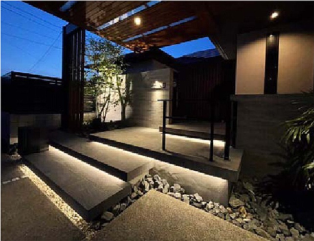 段差のある場所を照らす欠かせないライティングテクニックです。階段などを照らすことで自然と視線を誘導し、段差に気付かせ安全を作ります。