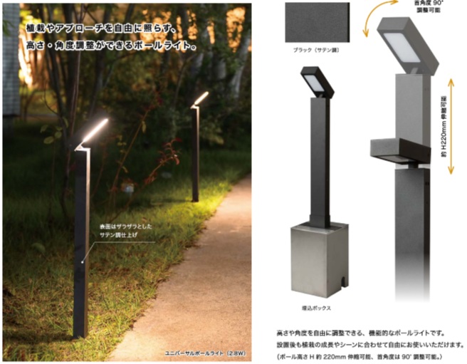 オンリーワンの『プリモ ユニバーサルポールライト』は、温かな灯で訪れる人や家族を優しく出迎えます。