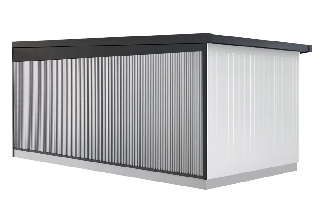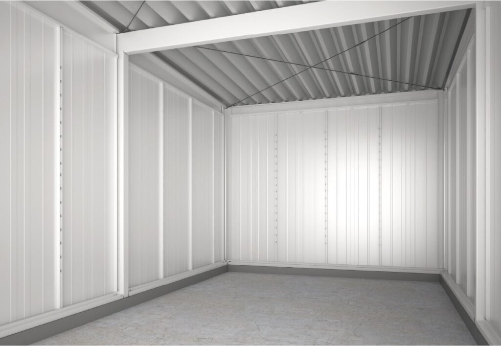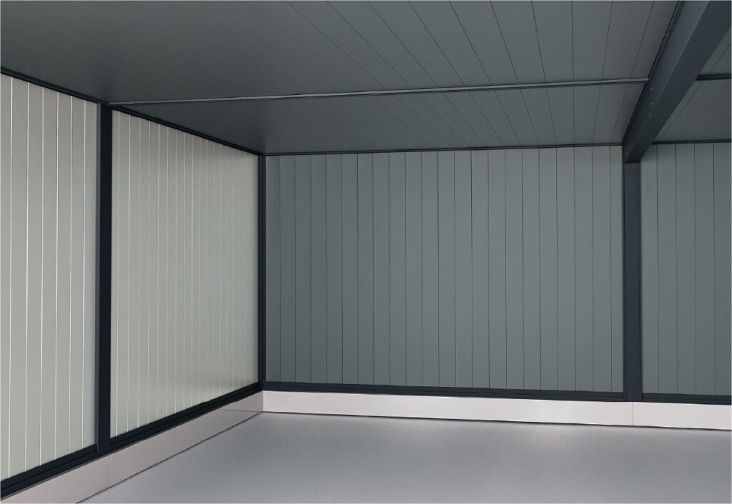 標準仕様の「ラヴィージュⅢ MODELLISTA×YODOKO」には、手動シャッター及び外装側面2面にヨドK型角波スパンが装着されます。基本棟に別途、追加棟を足して2連棟以上の連棟にすることも可能です。