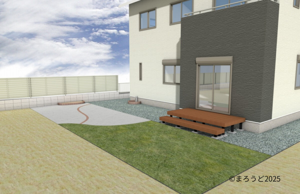 レンガでつくった曲線と人工芝とコンクリートの曲線で、柔らかいイメージに仕上がりました。