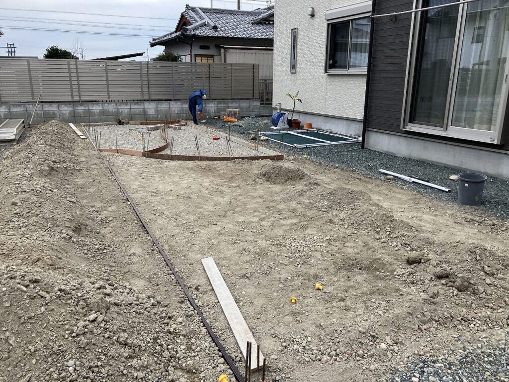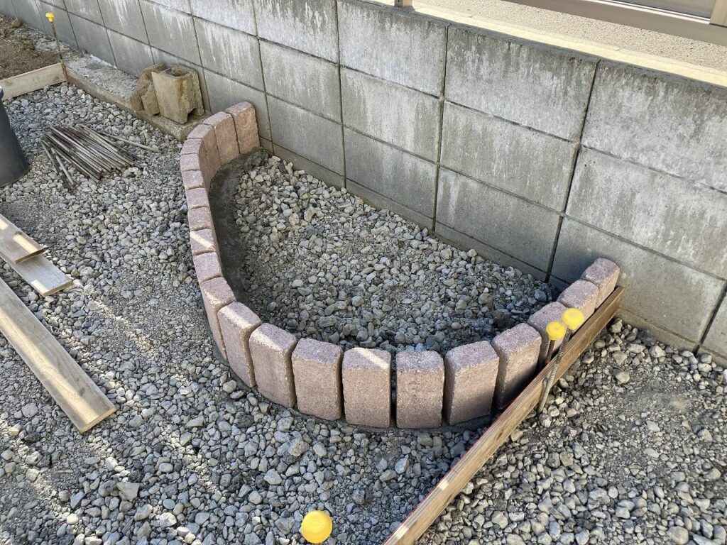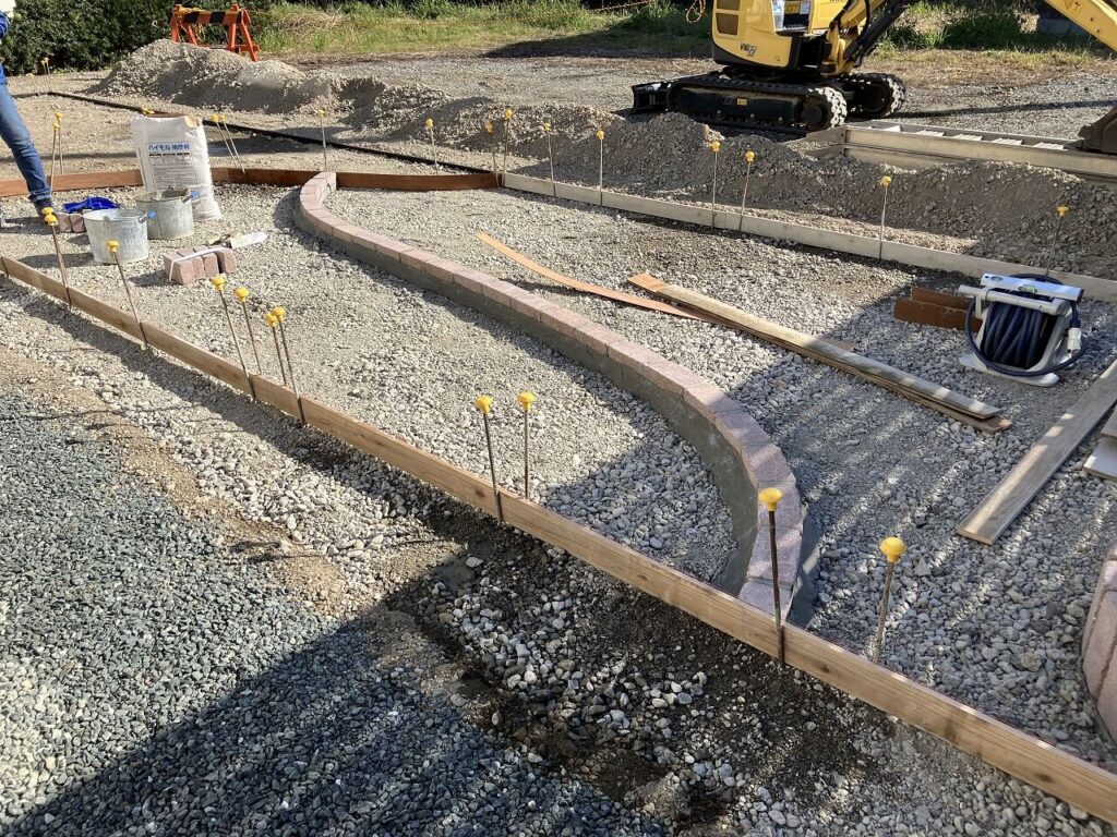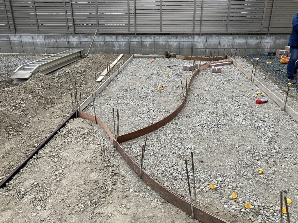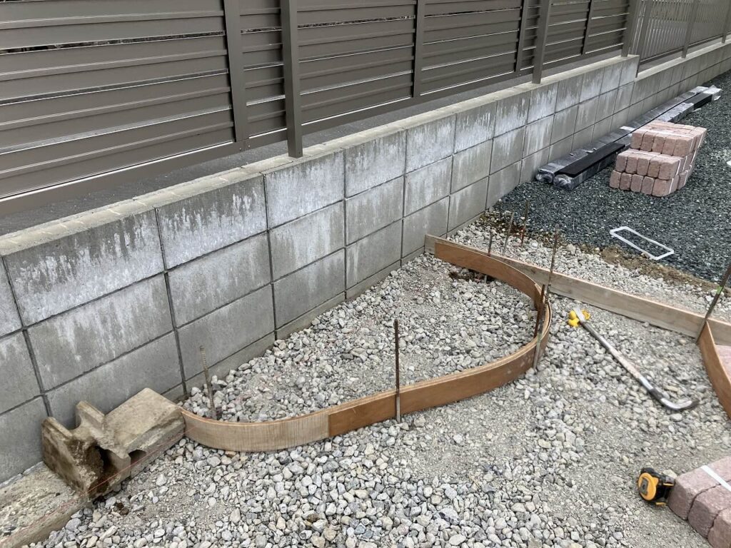 曲線のレンガ「ユニソン ミルドブリック60」ラインをアクセントにコンクリート打ちしました。
