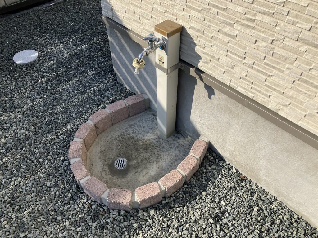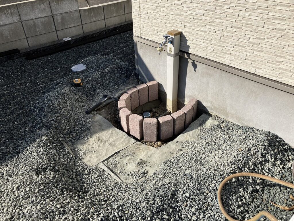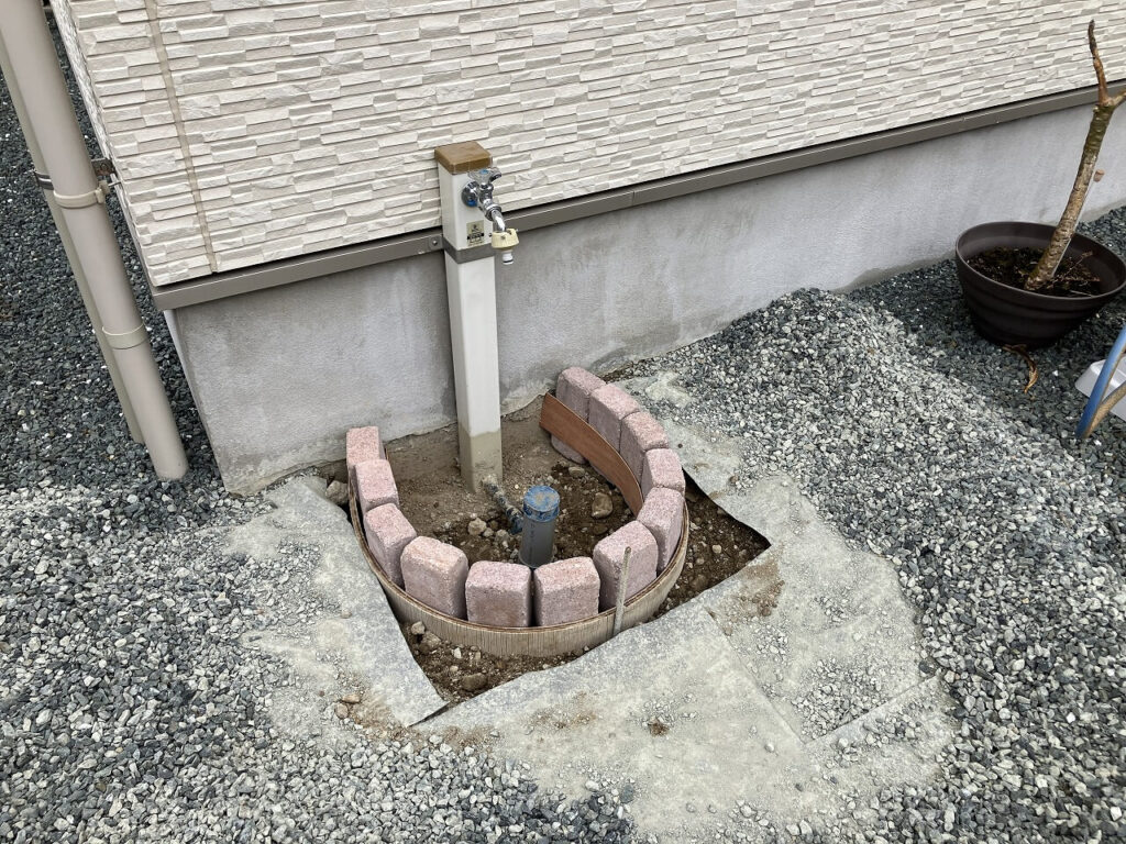 花壇と水栓受けにレンガ「ユニソン ミルドブリック60」を平立てで設置しました。