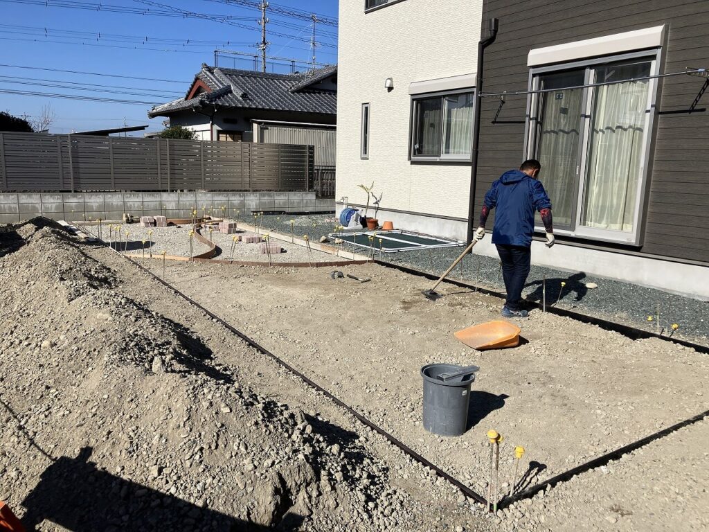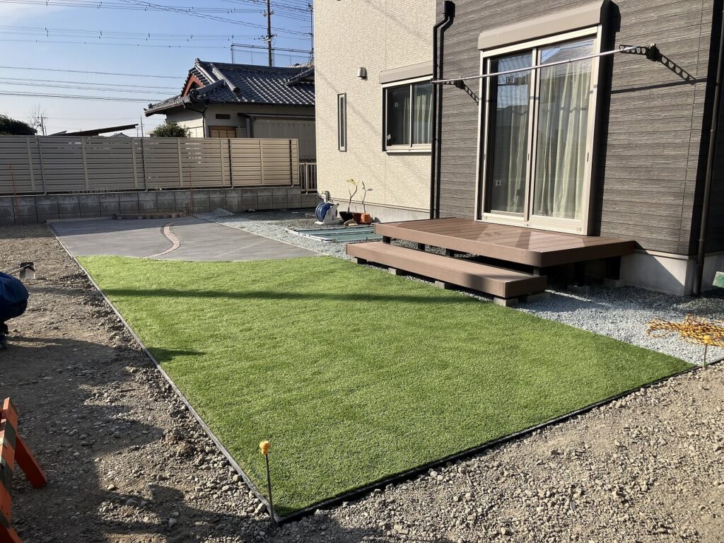 お施主様は《デッキが欲しい。人工芝を敷きたい。それ以外はコンクリートにして、花壇と水栓受けが欲しい。》ということでした。