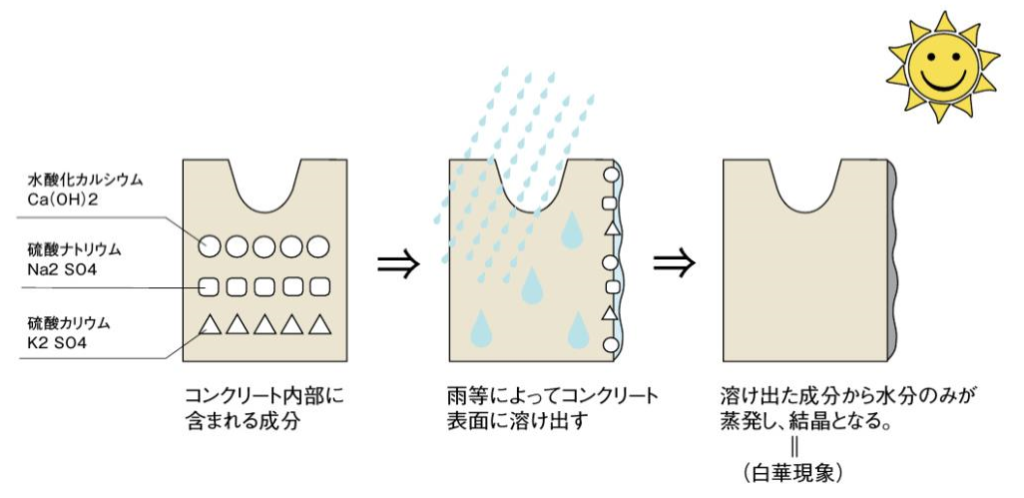 白華現象とは、水に溶けたアルカリ成分が乾いて、表面に白い結晶として現れることをいいます。