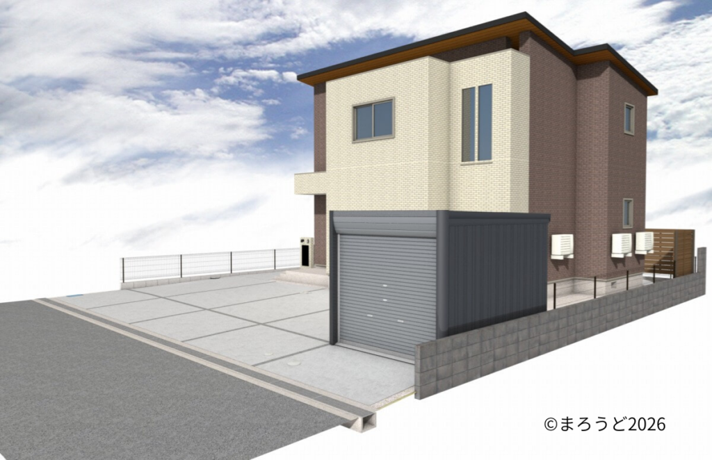 ガレージ「イナバ アルシアフィット」を設置し、ガレージ内はコンクリート金ゴテ仕上げ、オプションでリモコンシャッターと内施錠付引戸をつけました。