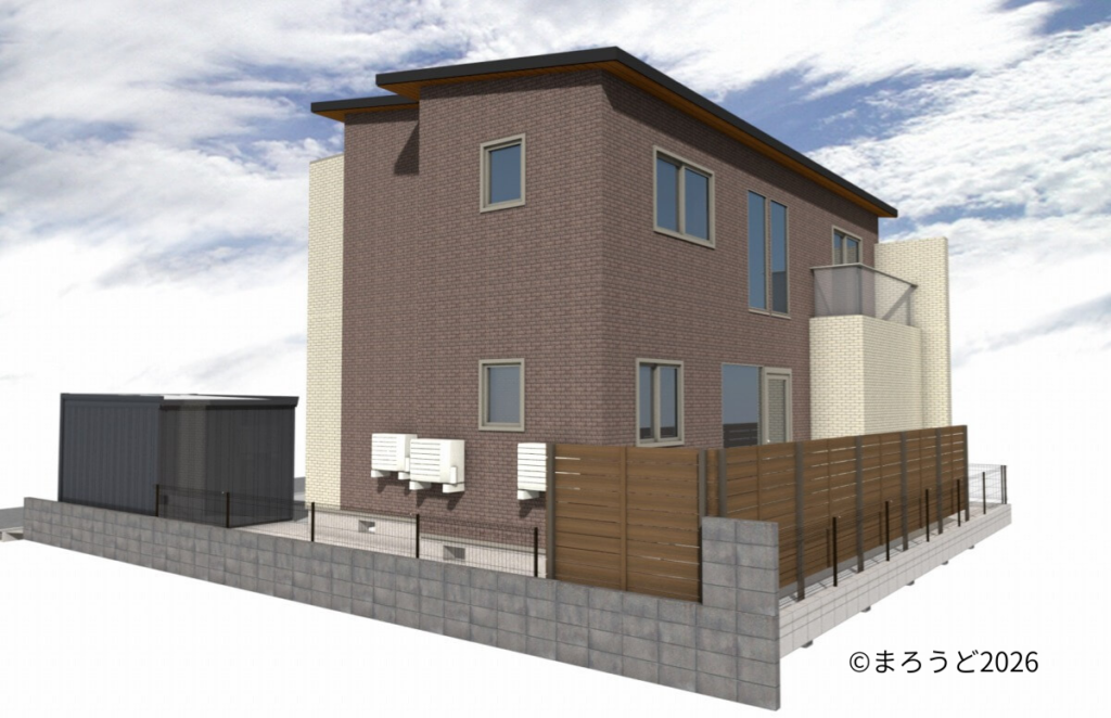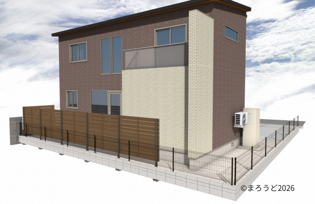 南側お庭はコンクリート打ちし、L字に目隠しフェンス「グローベン プラドリッチプラス H1800 ウォルナットブラウン」を独立施工しました。
