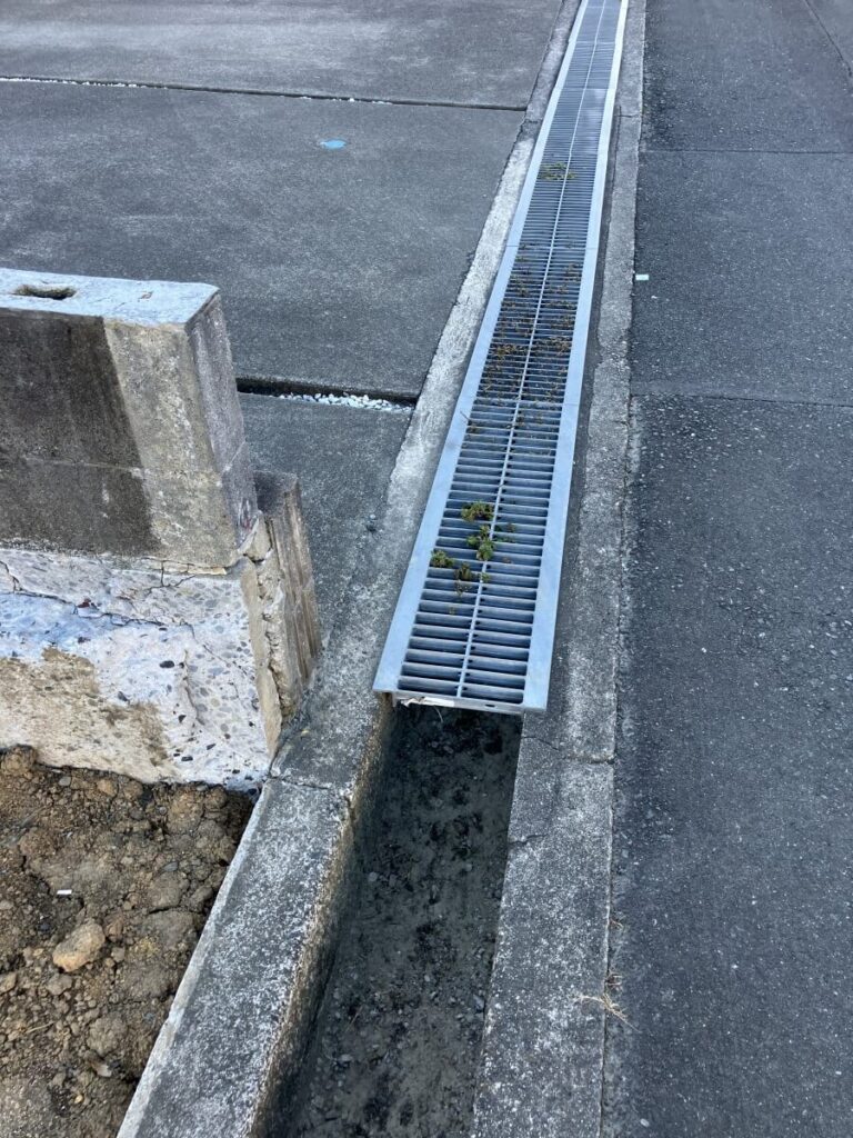 道路側溝は一部あったコンクリート蓋を撤去して、グレーチングで統一しました。