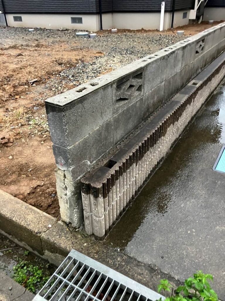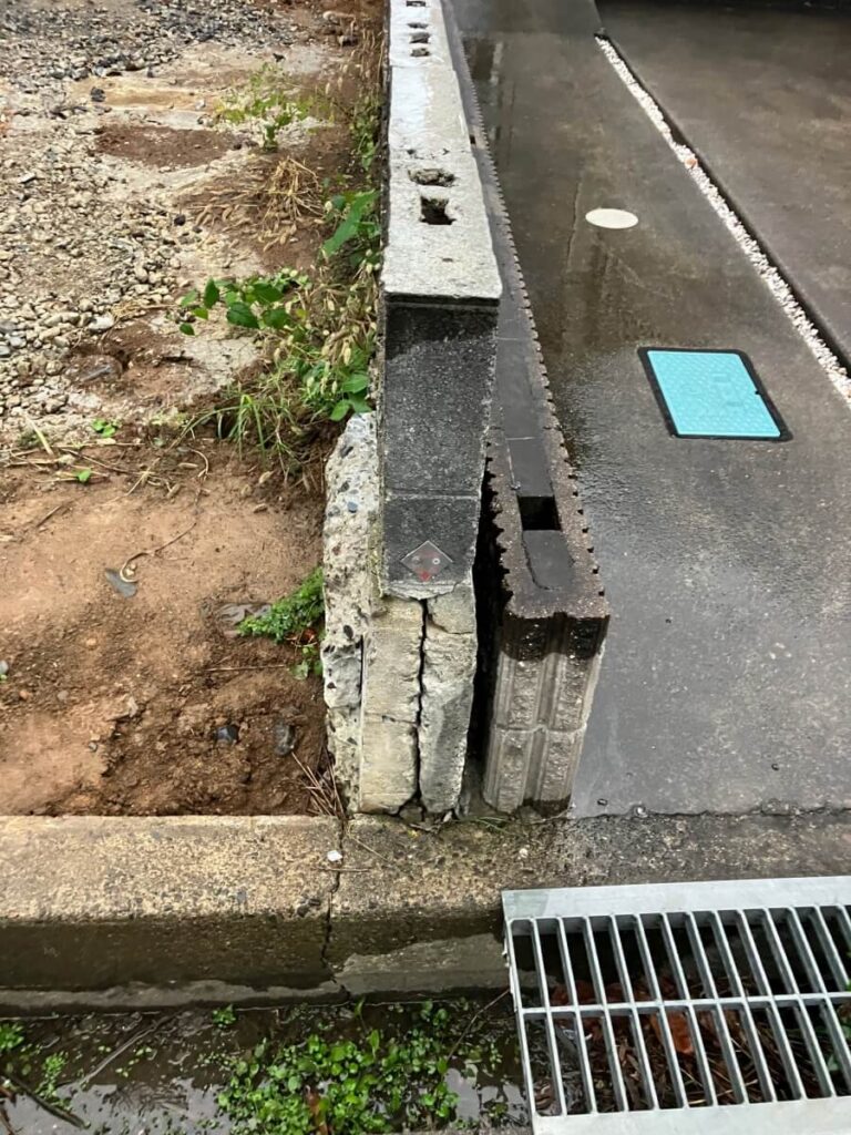 西側境界の既存コンクリートブロックを道路から800㎜分を基礎まで解体処分しました。