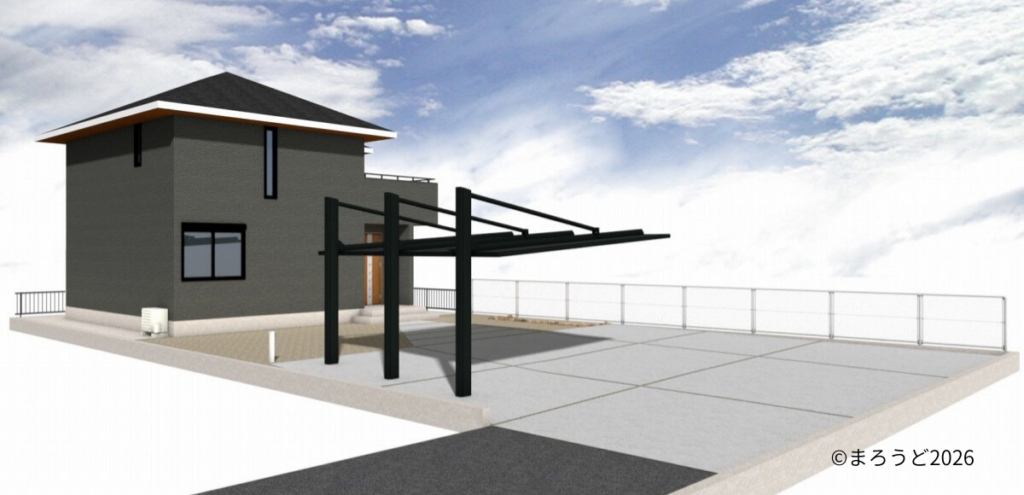 カーポート「三協アルミ ダブルフェース ブラックポリカ」を設置しました。3本の強靱な柱とアームで屋根をしっかり支える上吊りタイプです。ダイナミックな構造体で開放感があり、見通しもよく車の出し入れがしやすくなります。