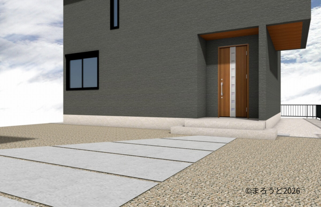 駐車場とアプローチはコンクリート打ちしました。まわりは防草シートとチャート石を敷き均しました。アプローチサイドの一部にチャート割栗石で囲み菜園スペースを作りました。駐車場の溝もチャート石を入れています。