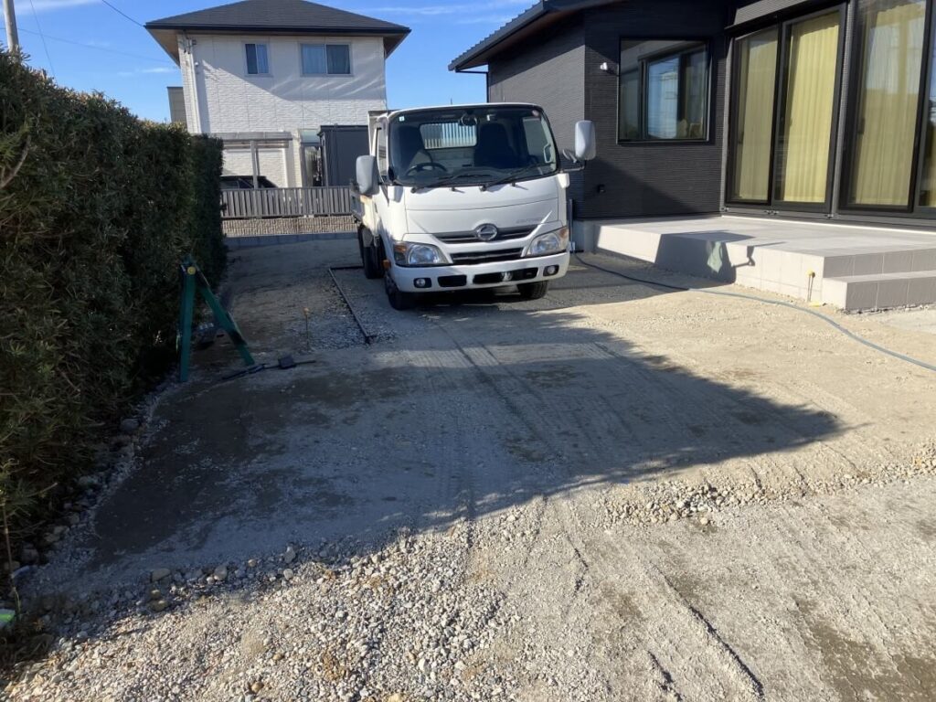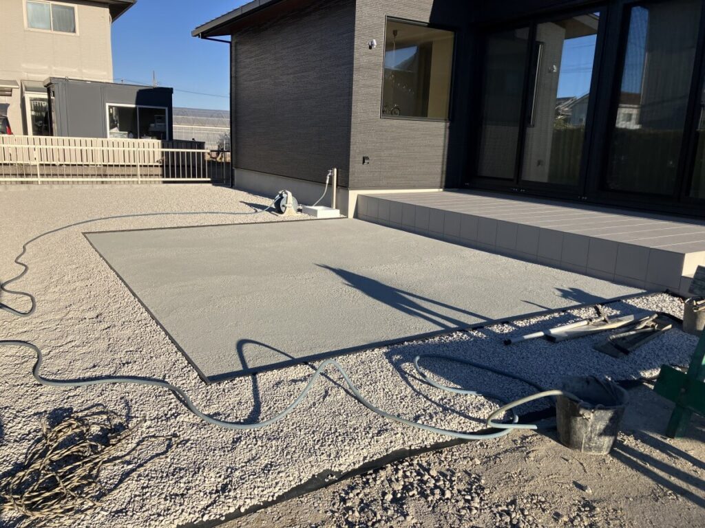 駐車場はコンクリート打ちし、タイルテラスの前にお施主様がご自身で人工芝を貼られるようにエコマウッドで見切りをつけ下地まで施工しました。