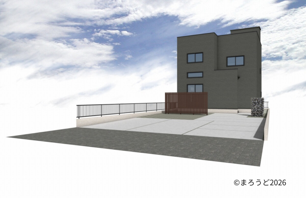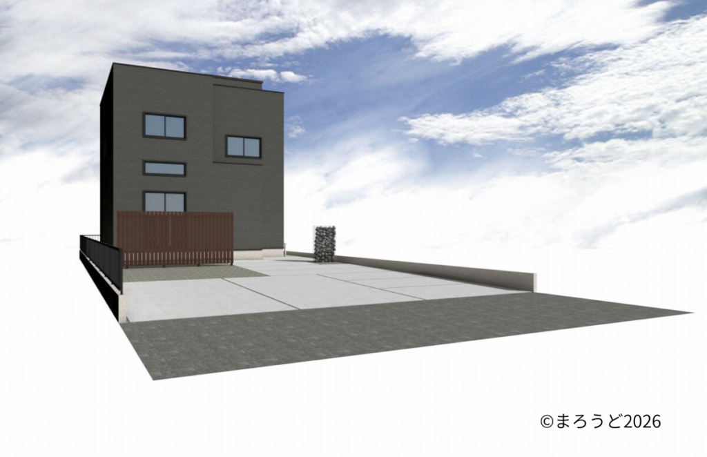 ファサードは駐車場とアプローチはコンクリート打ちしました。それ以外の掃き出し窓前、門壁まわり、溝は黒砕石を敷き均しました。