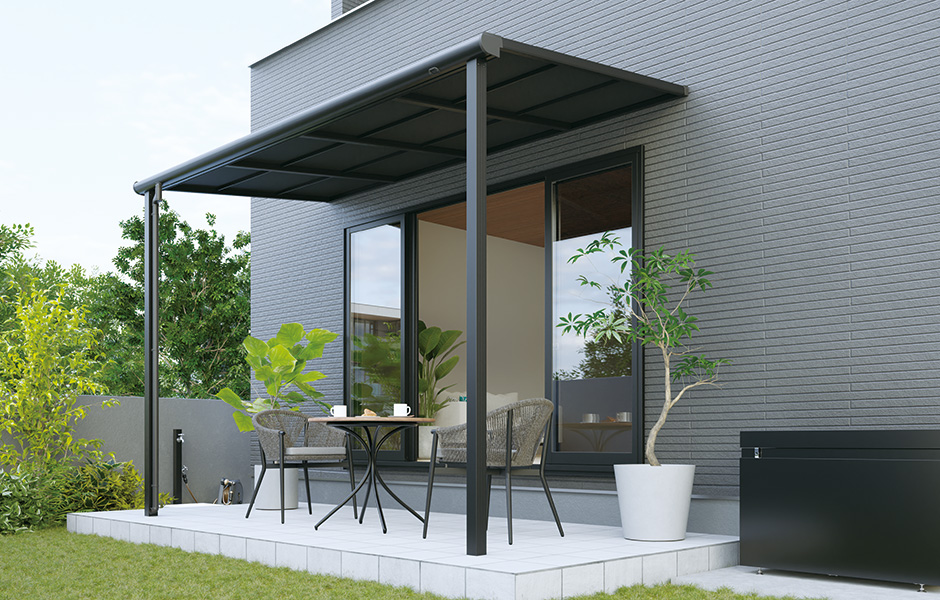 本体色のブラックを合わせて、透過性がなくマットな質感の屋根材が日傘のような日陰効果と涼しさを作り出すシャドークールなNEW STYLEテラスです。