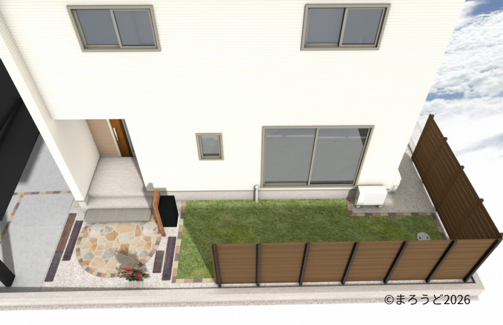 打ち合わせを重ね《お庭は人工芝にして宅配ポストを置きたい。玄関前や北側の駐車場奥はもう少しデザインを入れシンボルツリーが欲しい。》と最終的な形となりました。