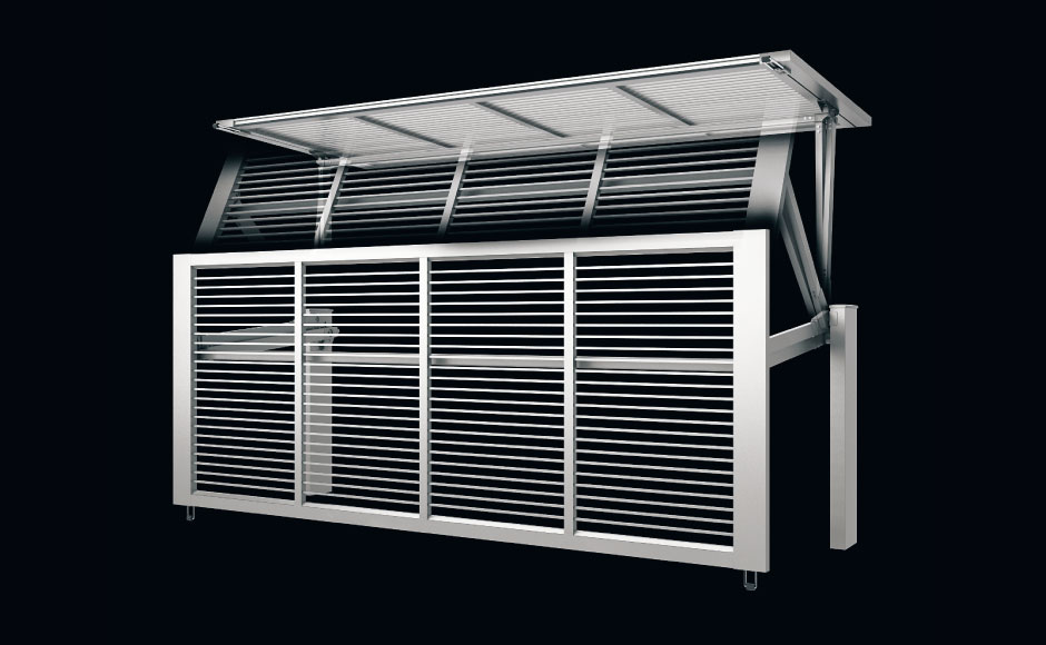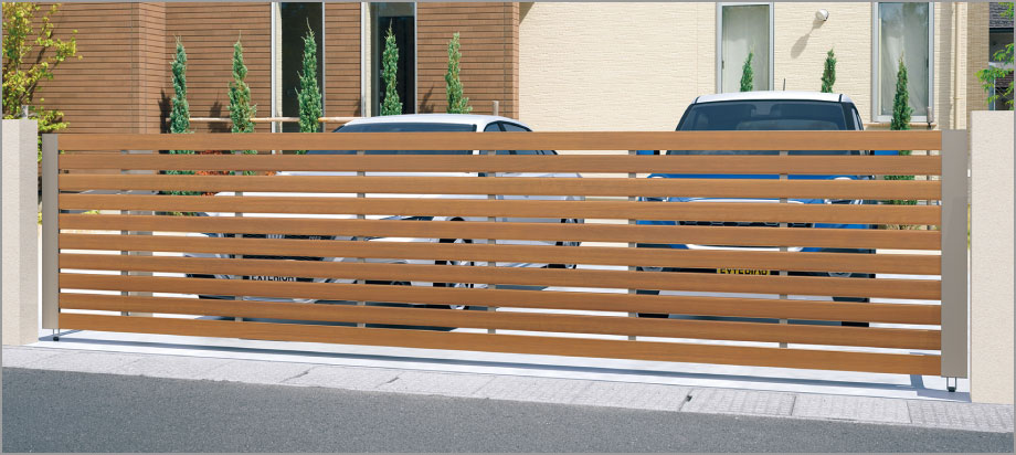 扉を上下に開閉する方式で道路へのはみ出しが少ない直昇式の車庫前門扉です。敷地を有効に使えます。