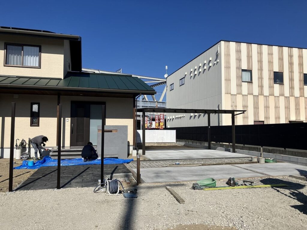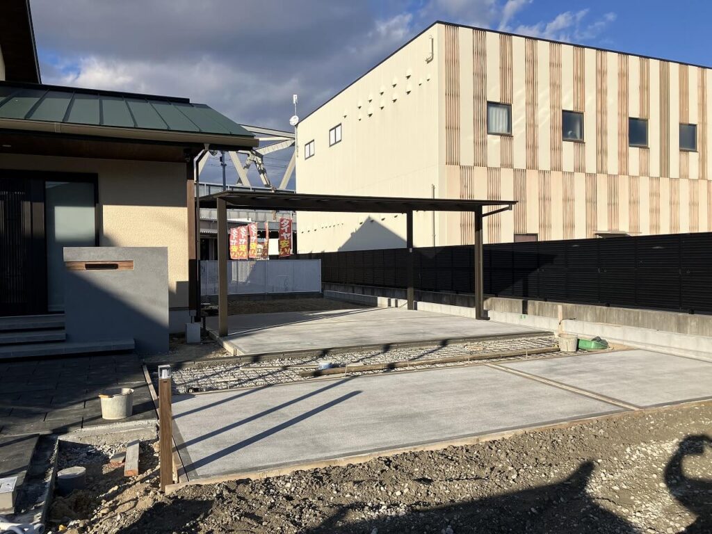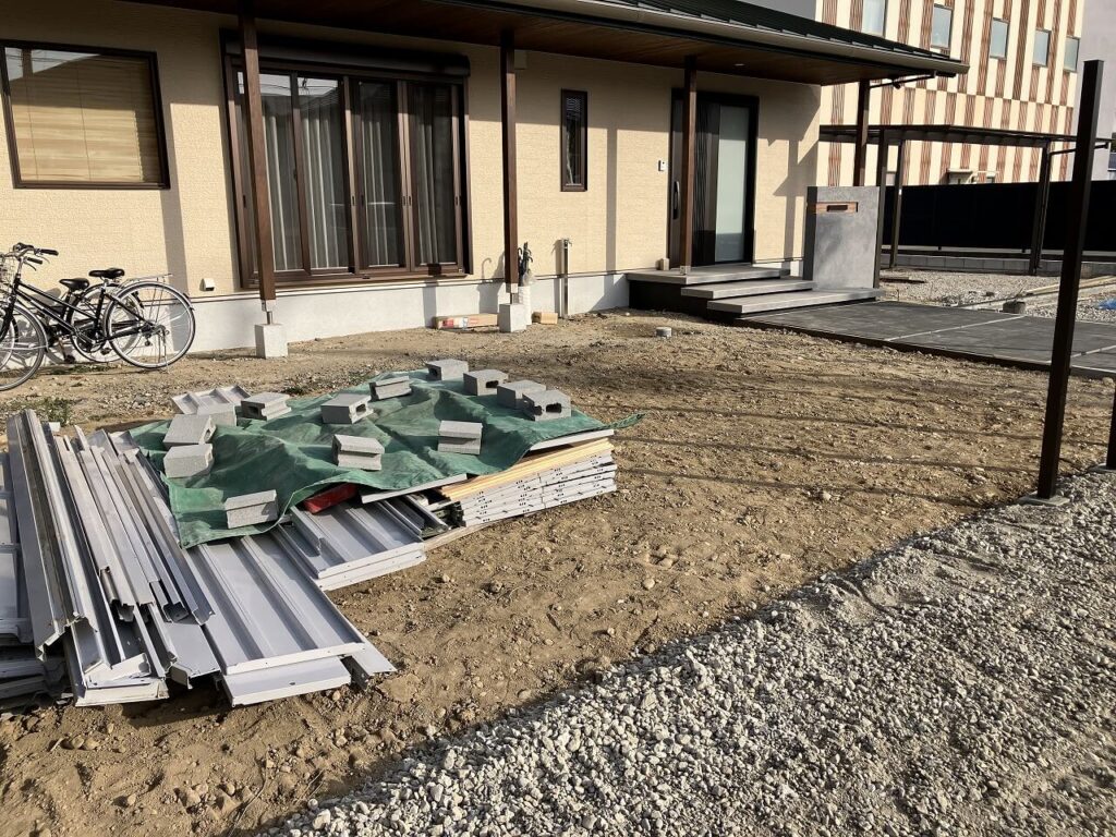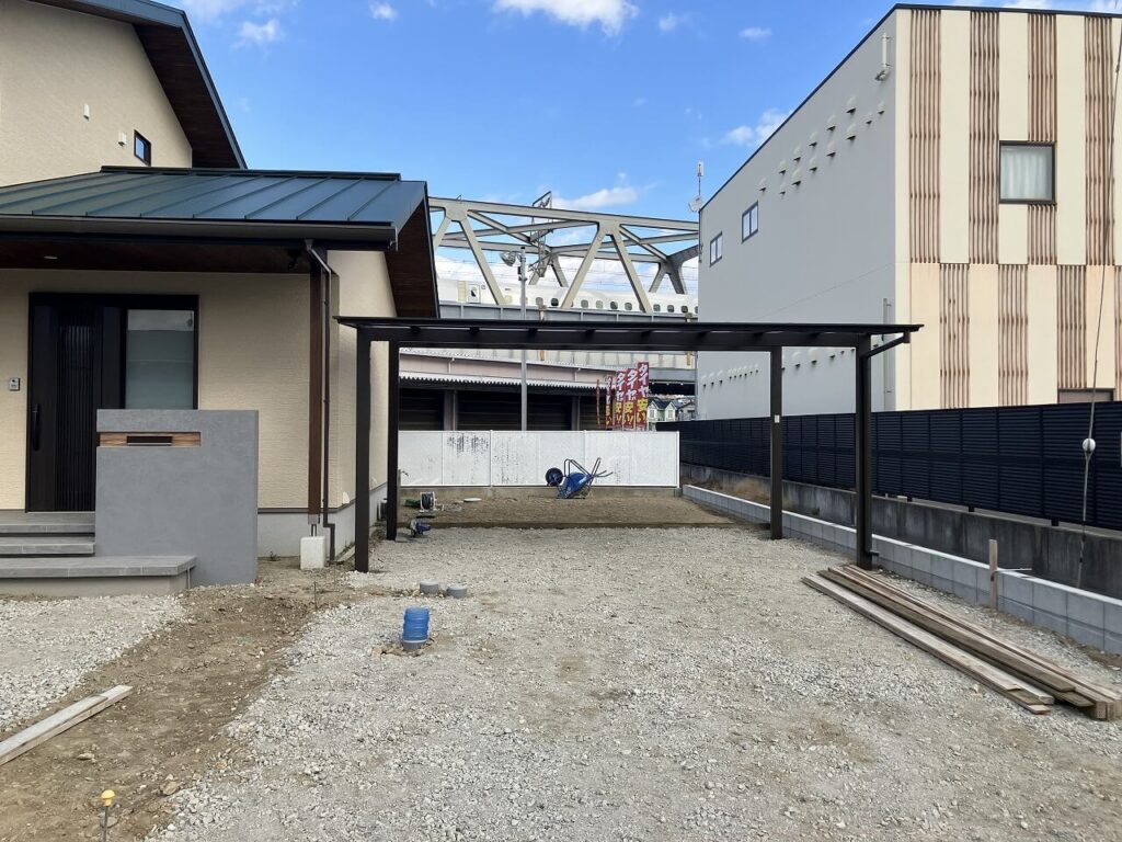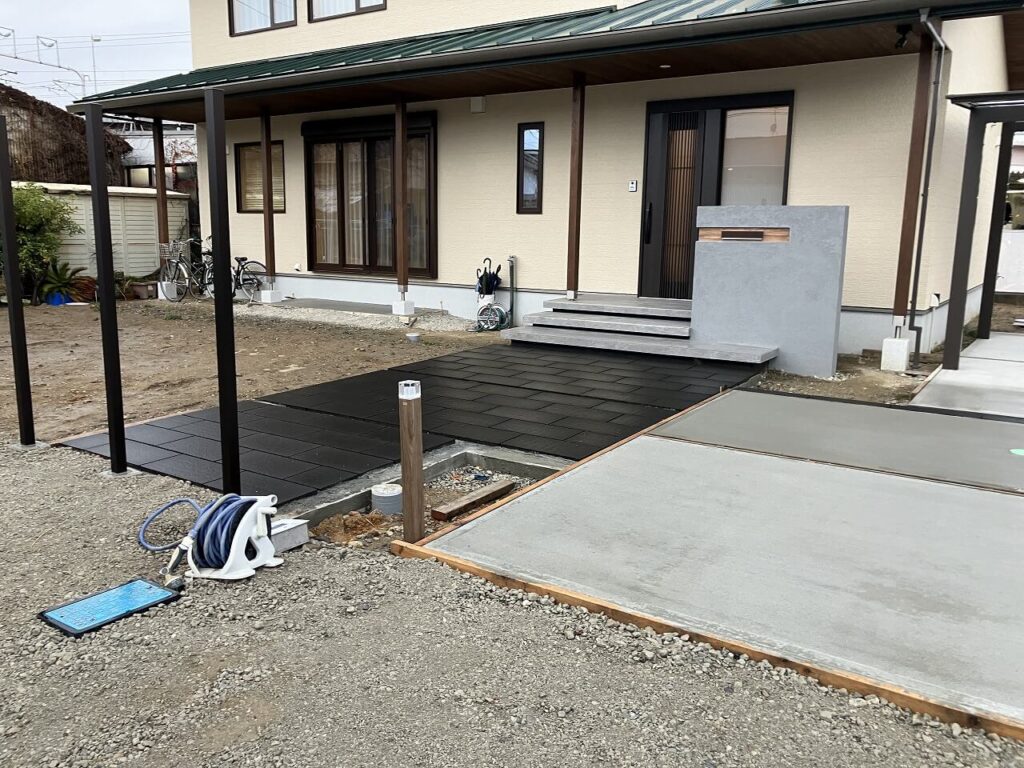 お庭はお施主様がDIYでつくられるということで、目隠しフェンス用のアルミ柱「三協アルミ ホロー材 60角 H1800 ダークブロンズ」を7ヶ所独立施工し横板を貼るだけにし、お施主様にて設置予定のデッキの下はコンクリート金ゴテ仕上げとしました。天然芝を張られるスペースも50㎜鋤取り(すきとり)し整地しました。