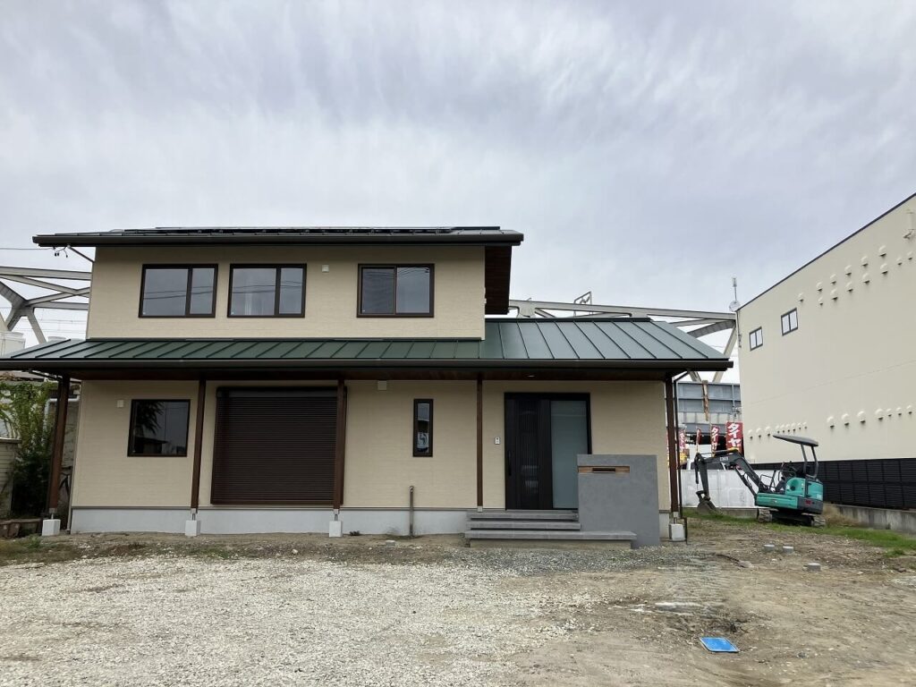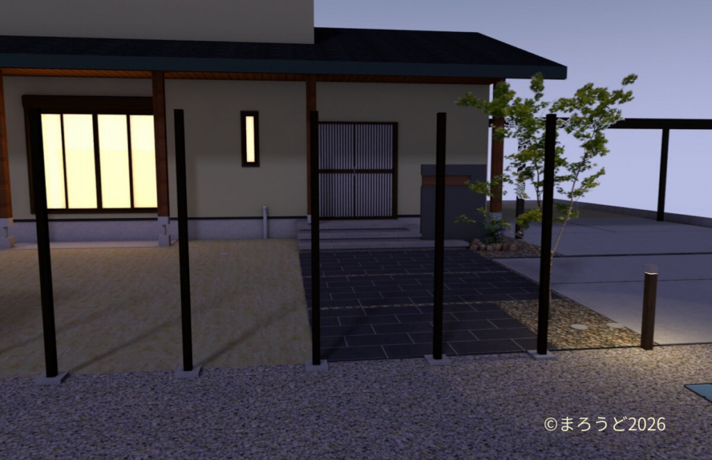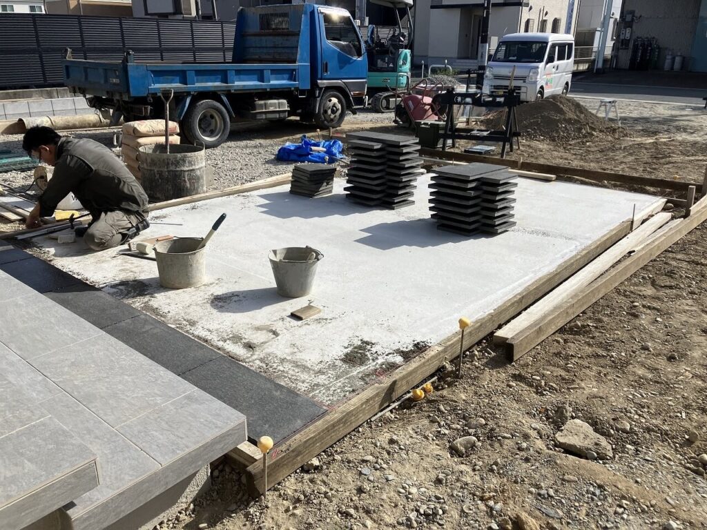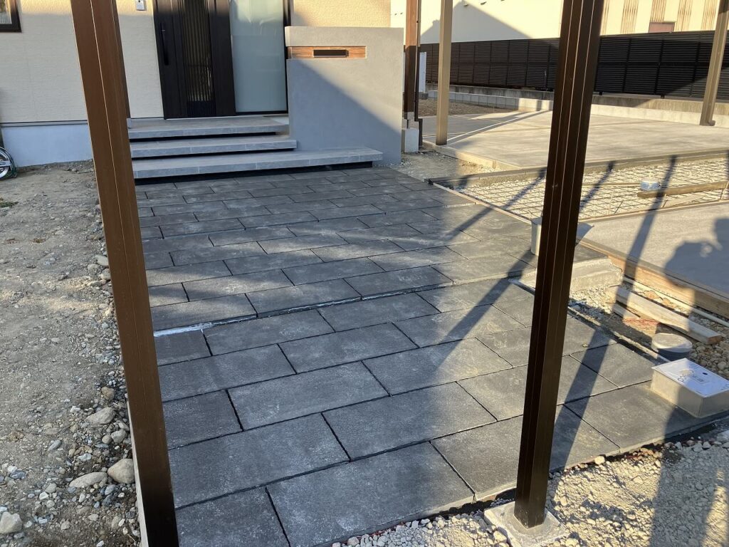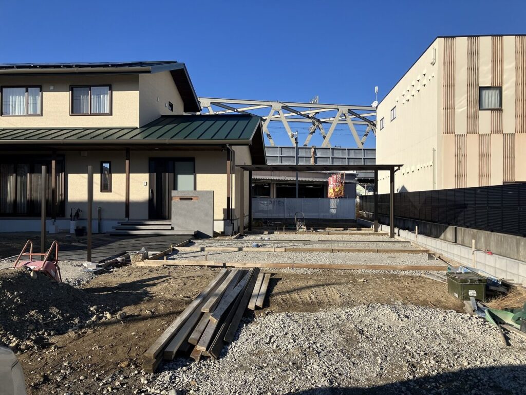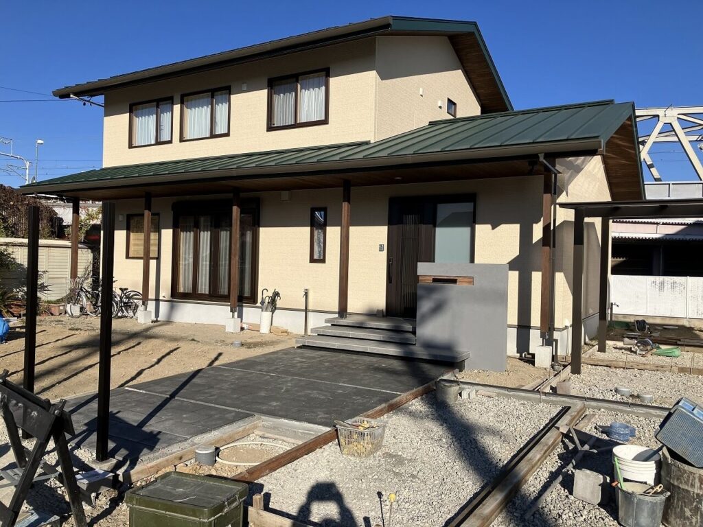 お庭はお施主様がDIYでつくられるということで、目隠しフェンス用のアルミ柱「三協アルミ ホロー材 60角 H1800 ダークブロンズ」を7ヶ所独立施工し横板を貼るだけにし、お施主様にて設置予定のデッキの下はコンクリート金ゴテ仕上げとしました。天然芝を張られるスペースも50㎜鋤取り(すきとり)し整地しました。
