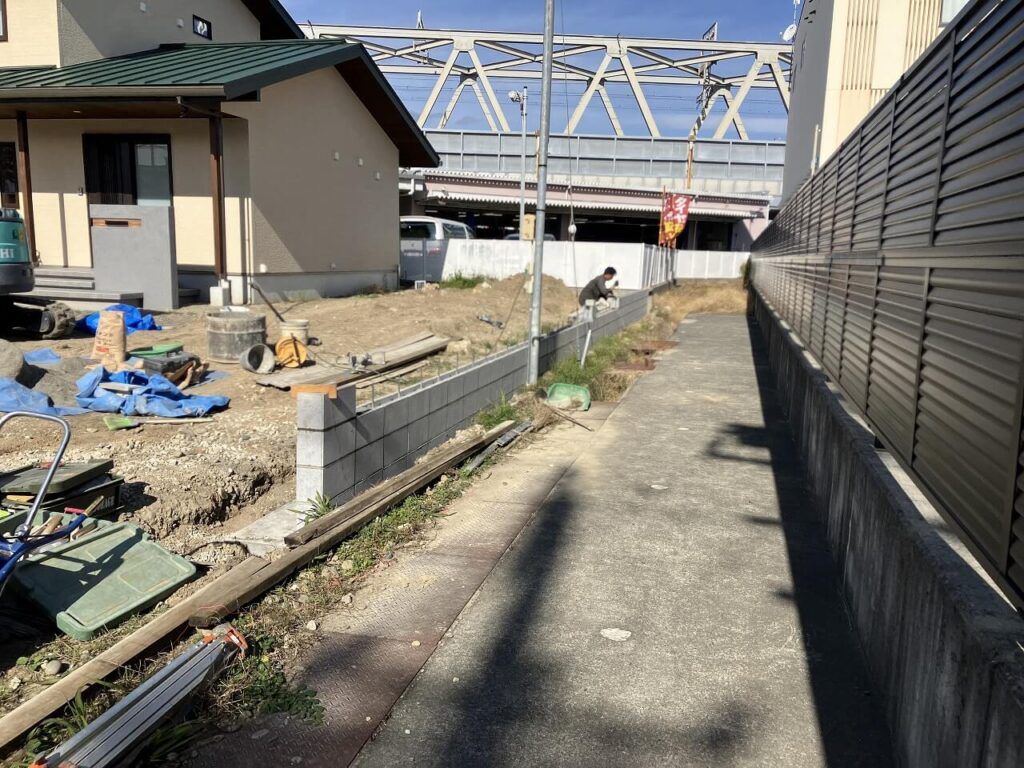 北側と西側の建物まわりは整地し、東側境界はコンクリートブロック4段積みました。