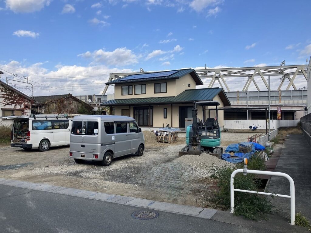 南側の敷地はRC再生砕石を敷き均しプレート転圧しました。予定が不明な場所には現状土のままビリ砕石を山積みしました。後日お施主様が施工する予定です。