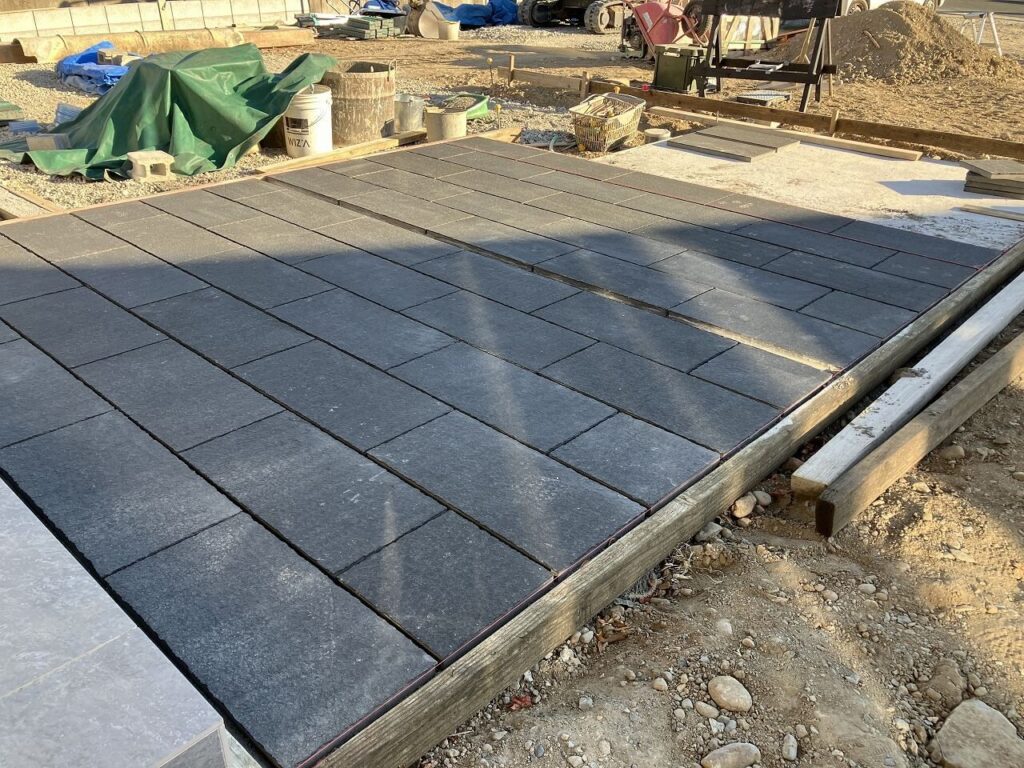 アプローチは天然石「ユニソン ワズプレート クマノ 600×300」貼りしました。